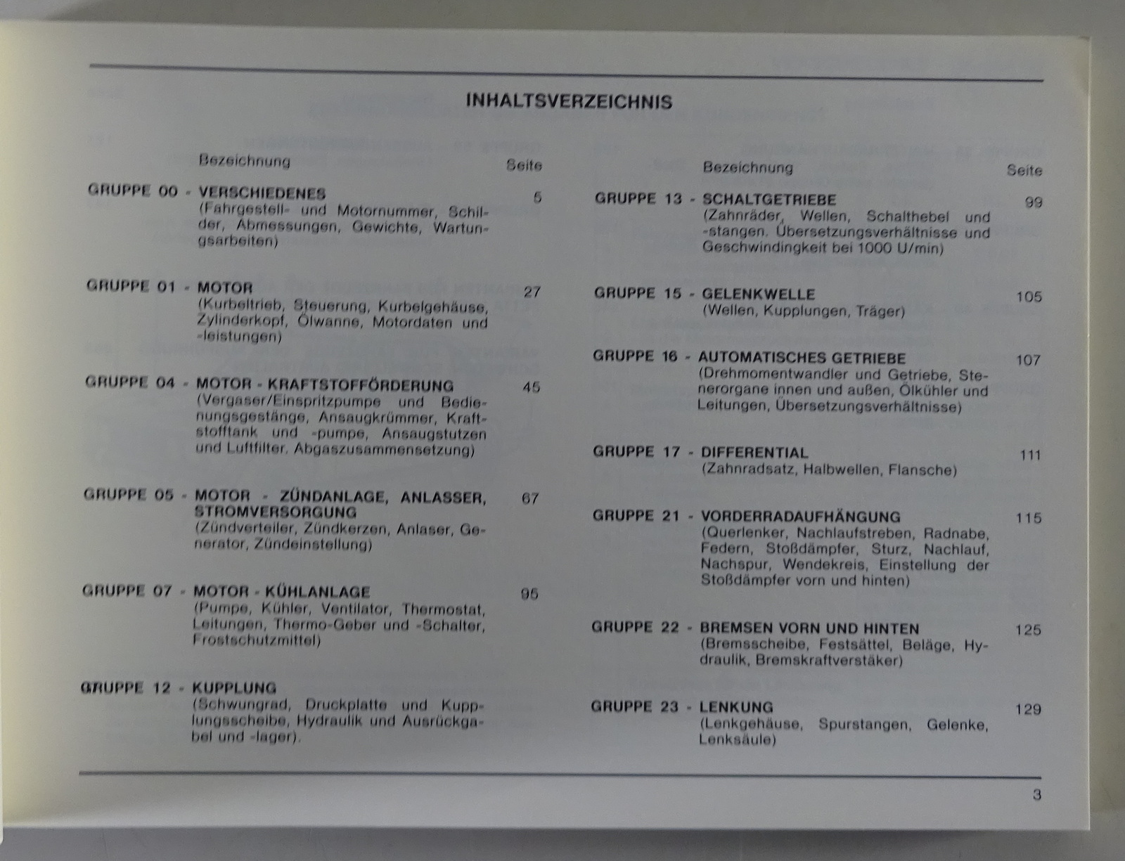 - für die Bereiche Motor, Kraftstoffsystem, Zündung, Kühlung, Kupplung, Getriebe, Differential, Vorderradaufhängung, Lenkung, Hinterradaufhängung, Räder und Reifen, Karosserie, Elektrik