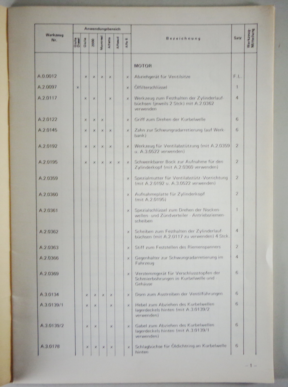 Inhalt: Tabellen mit Werkzeug-Nr., Anwendungsbereichen (Modelle), Bezeichnung, Satz, und Mitteilungen