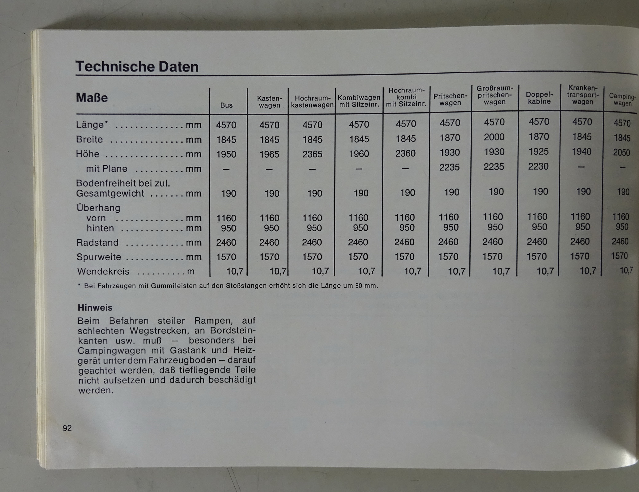 Bus / Kastenwagen / Hochraum-Kastenwagen / Kombiwagen / Hochraum-Kombiwagen / Pritschenwagen / Großraum-Pritschenwagen / Doppelkabine / Kranktransportwagen / Campingwagen