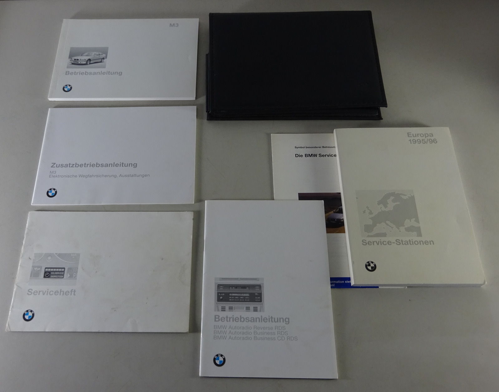 Inhalt: Betriebsanleitung, BMW Service Stationen Verzeichnis 95/96, BMW Service Card, Zusatzanleitung M3, Autoradio Reverse / Business RDS, Serviceheft mit Einträgen bis 263.296 km.