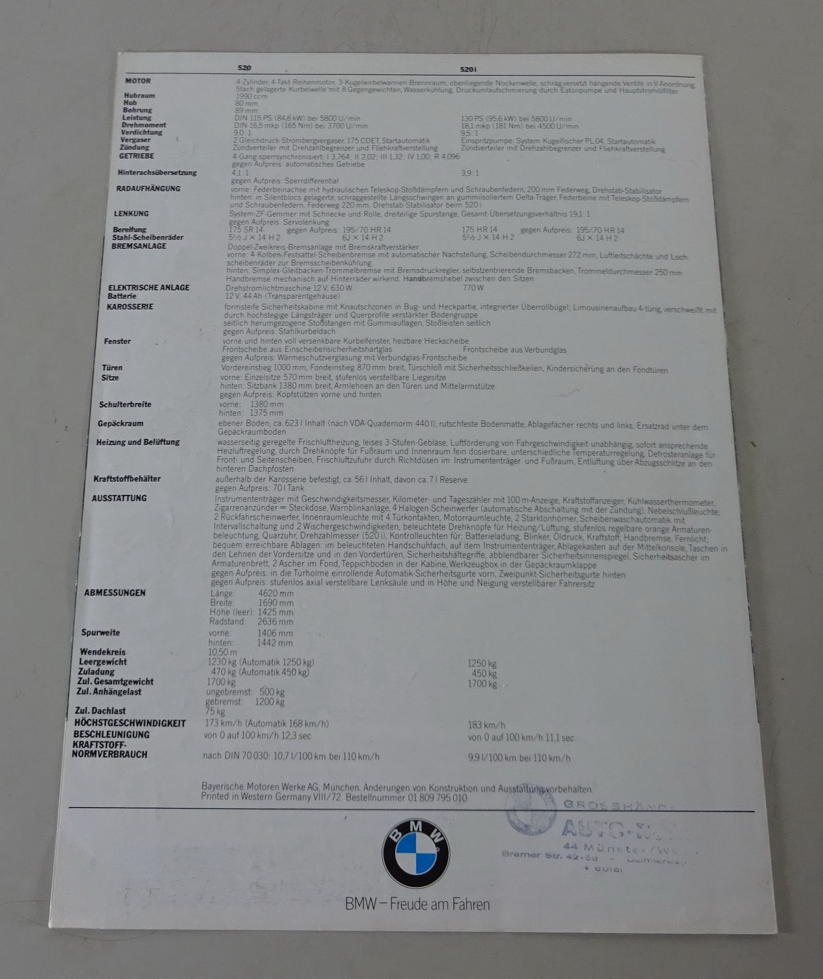 Prospekt / Broschüre BMW E12 520 / 520i Stand 08/1972