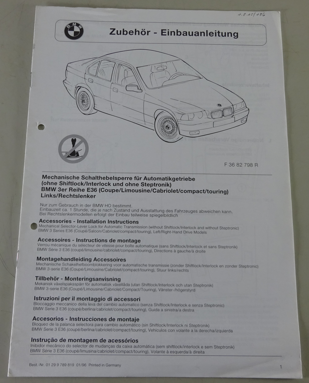 Produktinformationen "Einbauanleitung BMW 3er E36 Mechanische Schalthebelsperre Automatikgetriebe 1/96"
