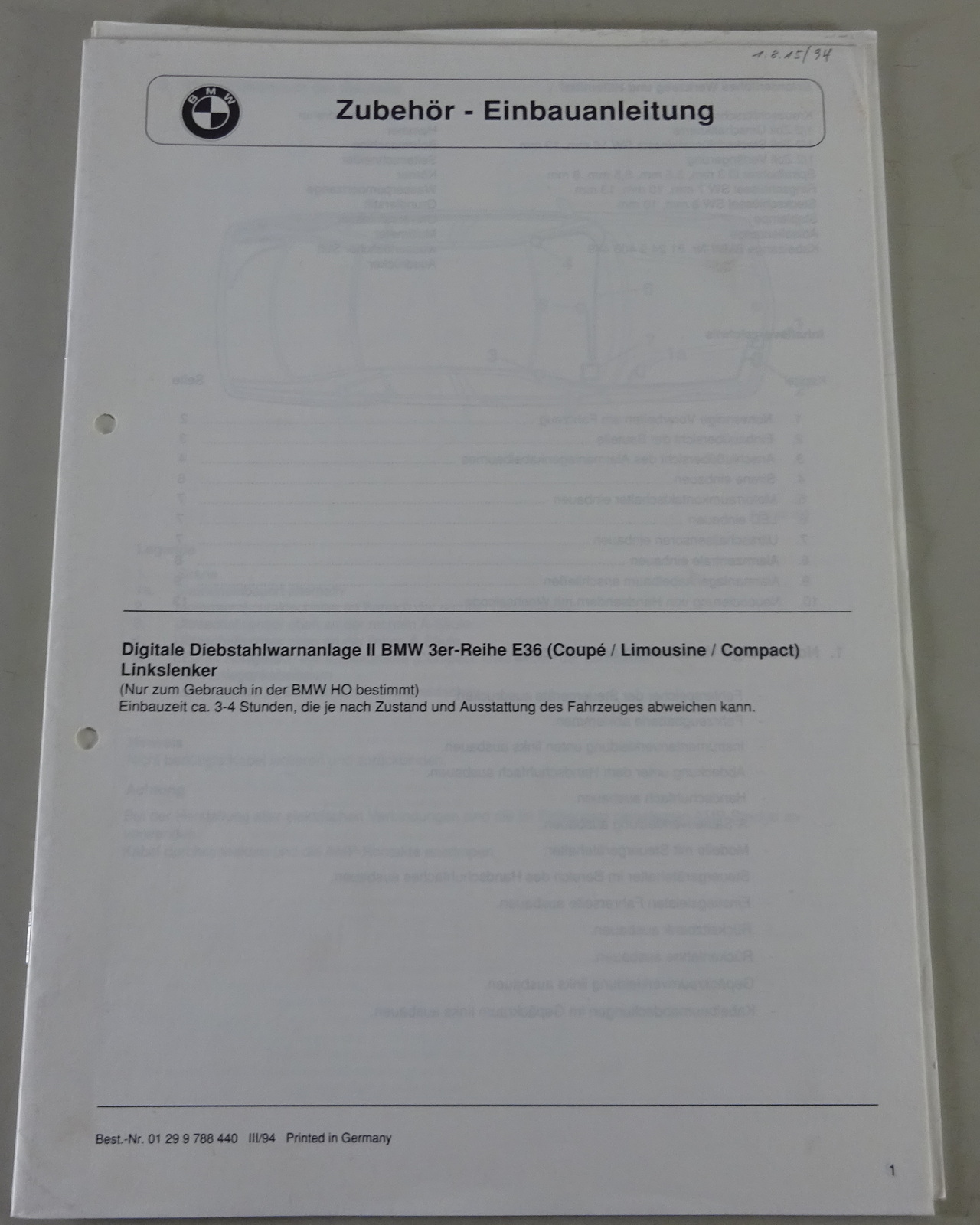 Produktinformationen "Einbauanleitung BMW 3er E36 Digitale Diebstahlwarnanlage II Linkslenker 03/1994"