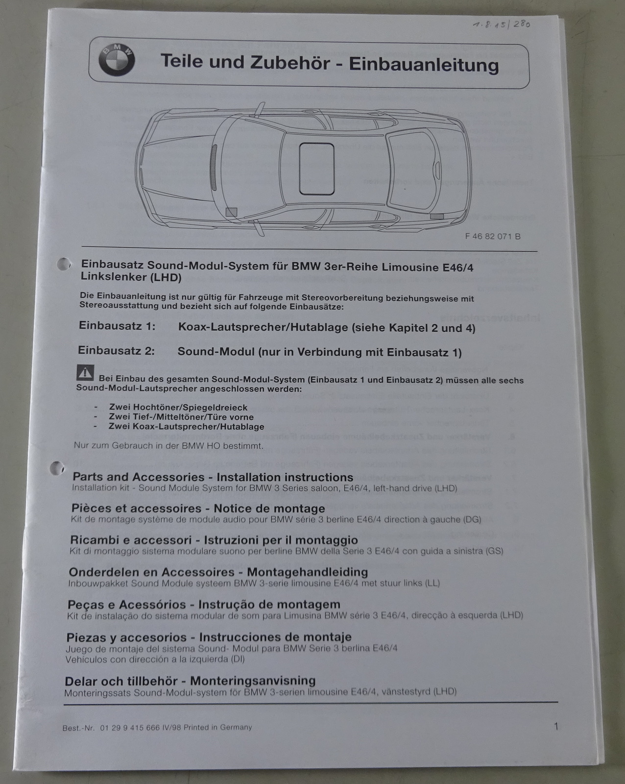 Produktinformationen "Einbauanleitung BMW 3er E46 Limousine Einbausatz Sound-Modul-System Stand 4/1998"