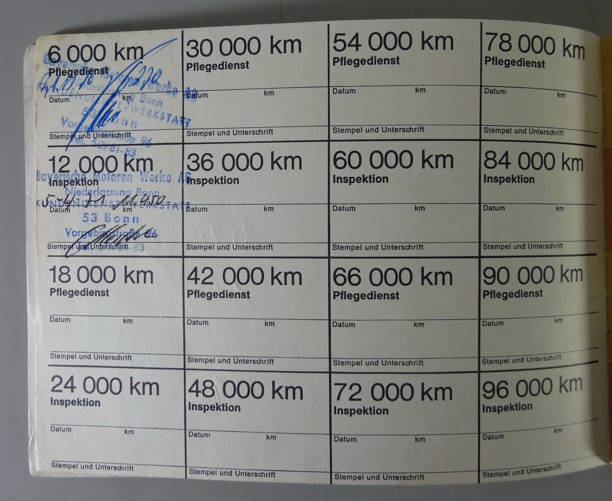Inhalt: Betriebsanleitung mit Schmierplan und elektr. Schaltplan, BMW Händlerverzeichnis Europa, Service-Scheckheft mit Einträgen bis 12000km