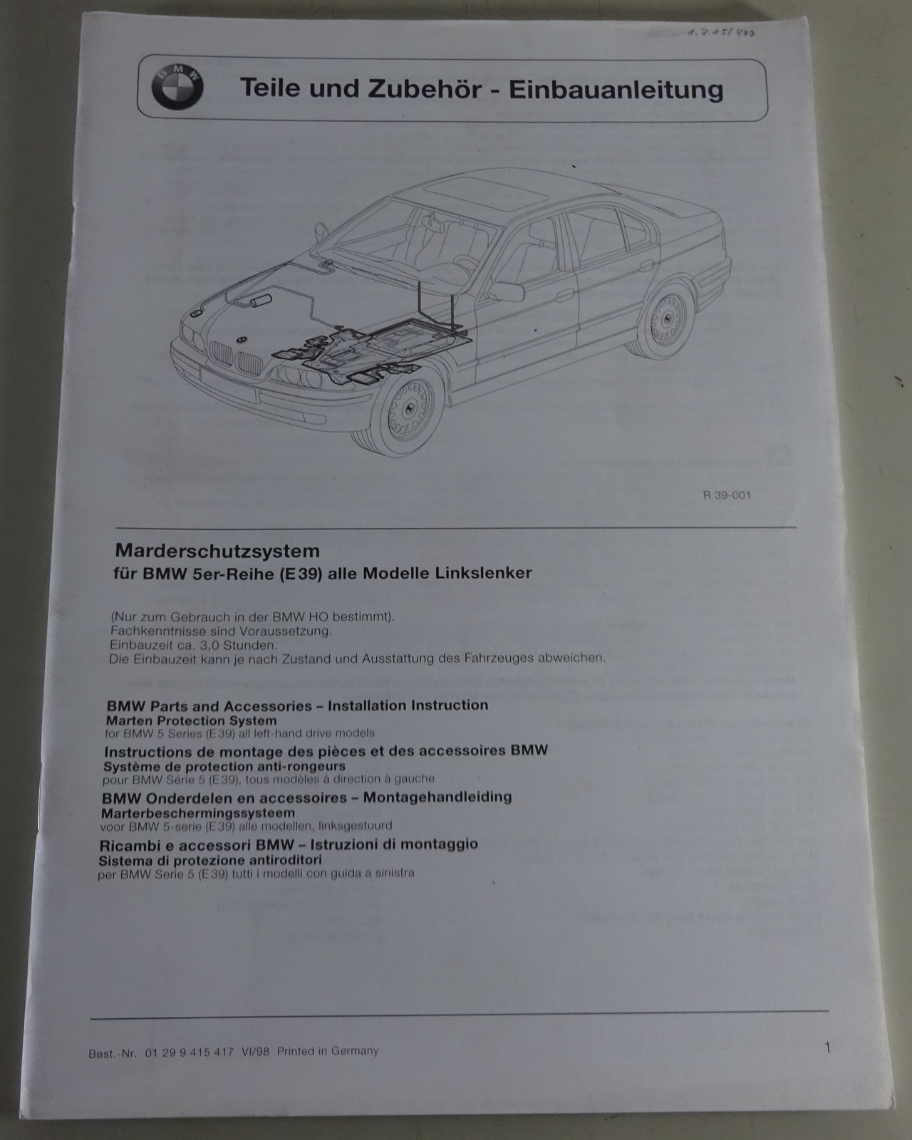 Produktinformationen "Einbauanleitung BMW Marderschutzsystem für E39 Teile und Zubehör Stand 06/1998"