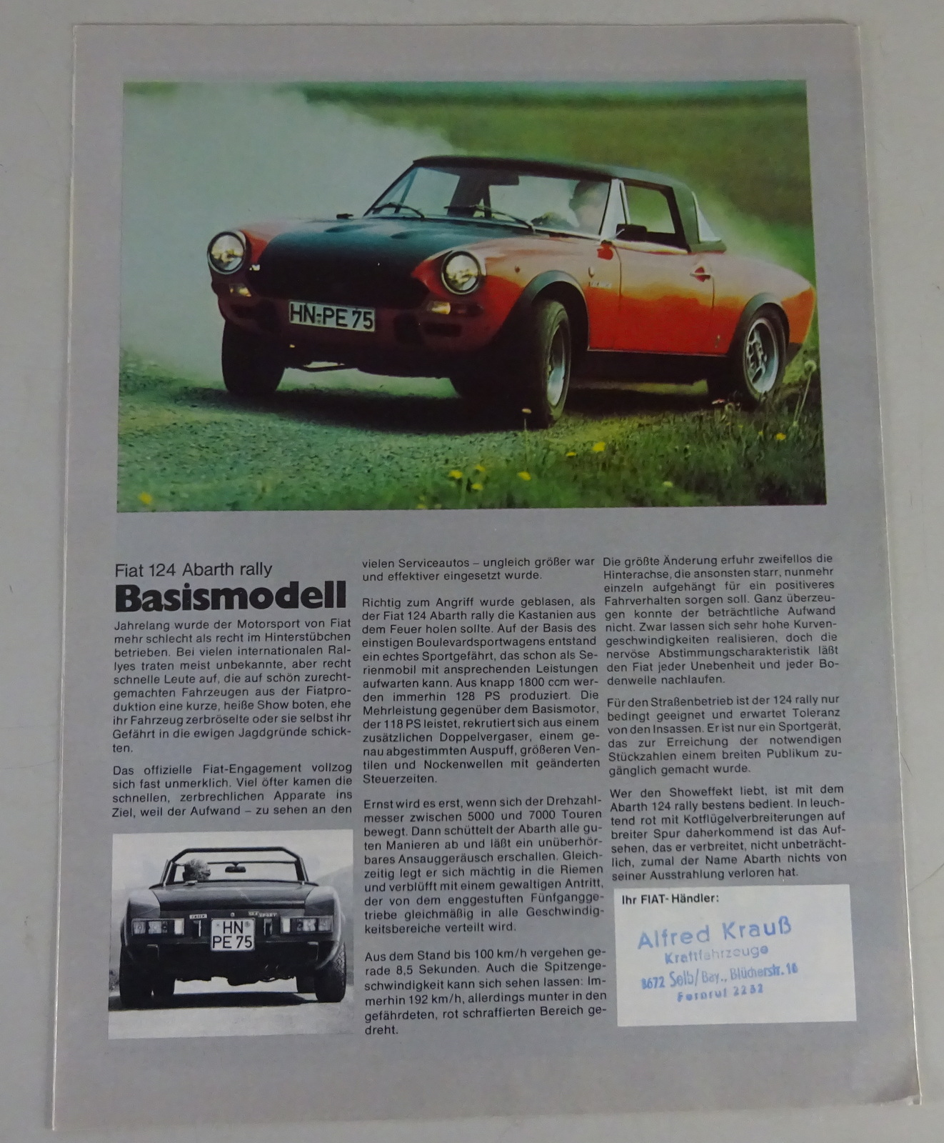 Prospekt / Prospektblatt | Fiat / Abarth 124 Rallye Racing Händlerstempel | 8/74