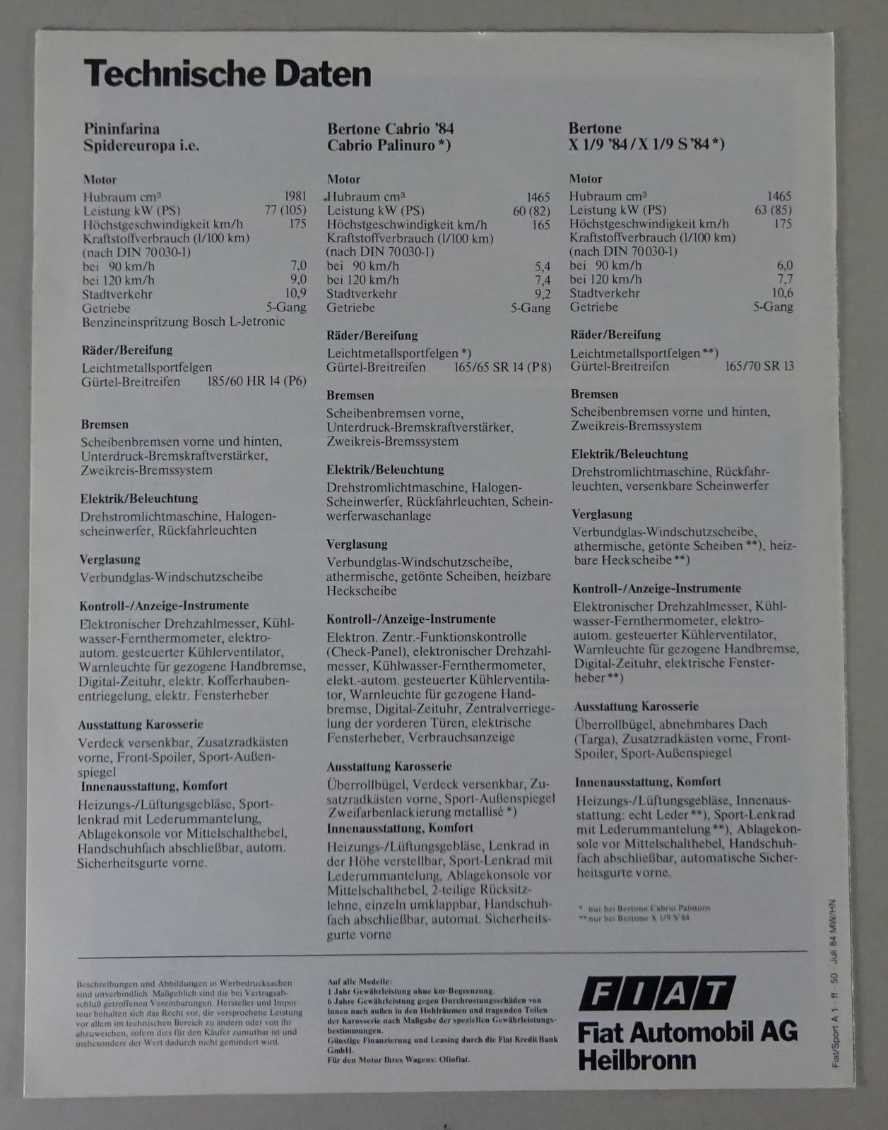 Prospekt / Prospektblatt | Fiat X1/9 / Ritmo Cabrio / 124 Spidereuropa | 07/1984