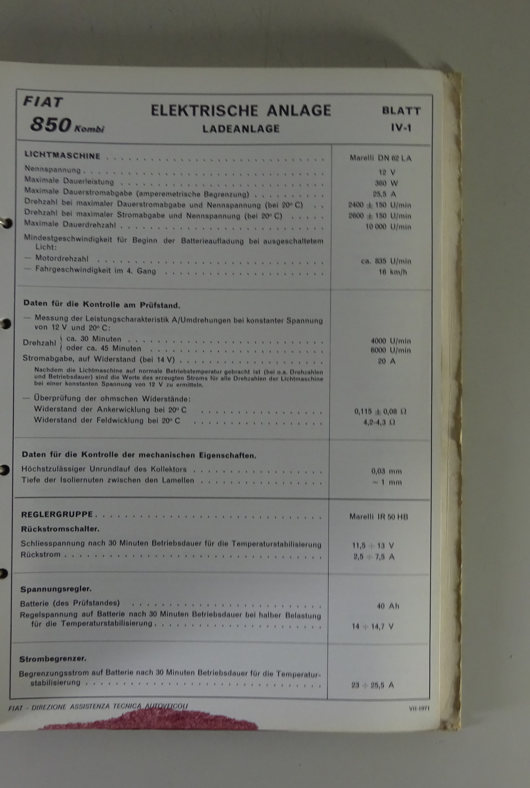 Produktinformationen "Werkstatthandbuch Hauptmerkmale & Daten Fiat 850 Kombi / 850T Stand 07/1971"