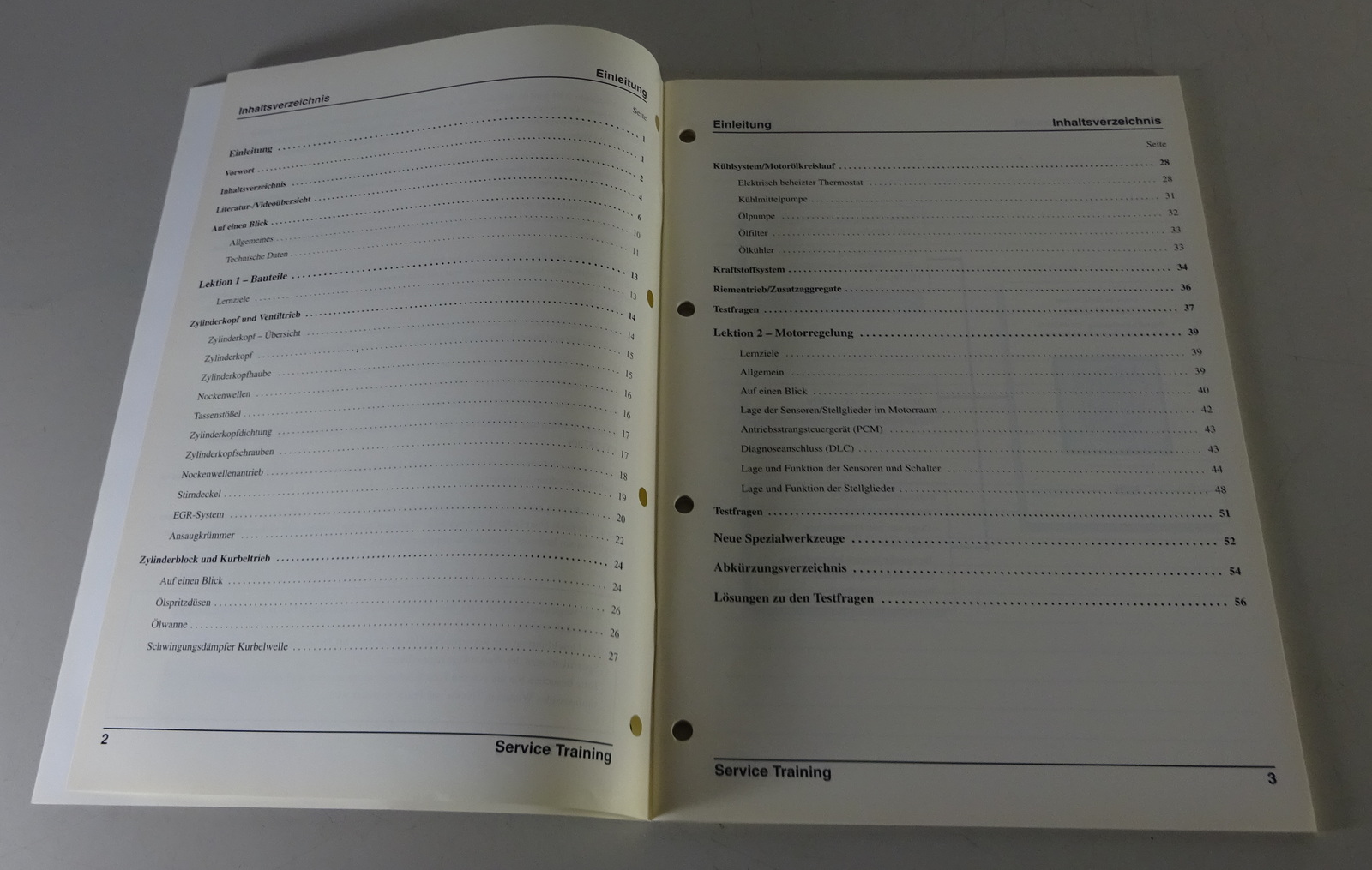 Inhalt: Vorwort, Inhaltsverzeichnis, Literatur/Videoübersicht, Auf einen Blick, Zylinderkopf und Ventilbetrieb, Bauteile-Motor, Motorschmierung, Motorkühlung, Motorregelung-Übersicht, Motorregelung-Bauteile, Ansaugsystem, Kraftstoffsystem, Zündsystem, Abgassystem, Schaltpläne/ Steckerbelegung, Diagnose, Übersicht- Neue Spezialwerkzeuge/ Diagnoseausrüstung, Technische Daten, Abkürzungsverzeichnis.