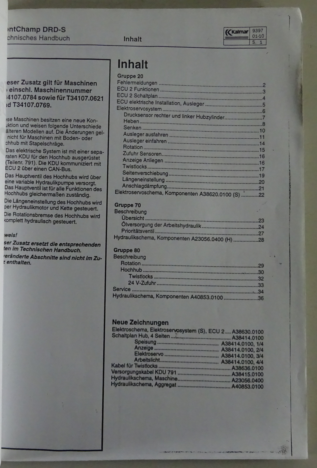 Produktinformationen "Technisches Handbuch Ergänzung für Kalmar KDU Hochhub DRD 420-450 Stand 10/2001"