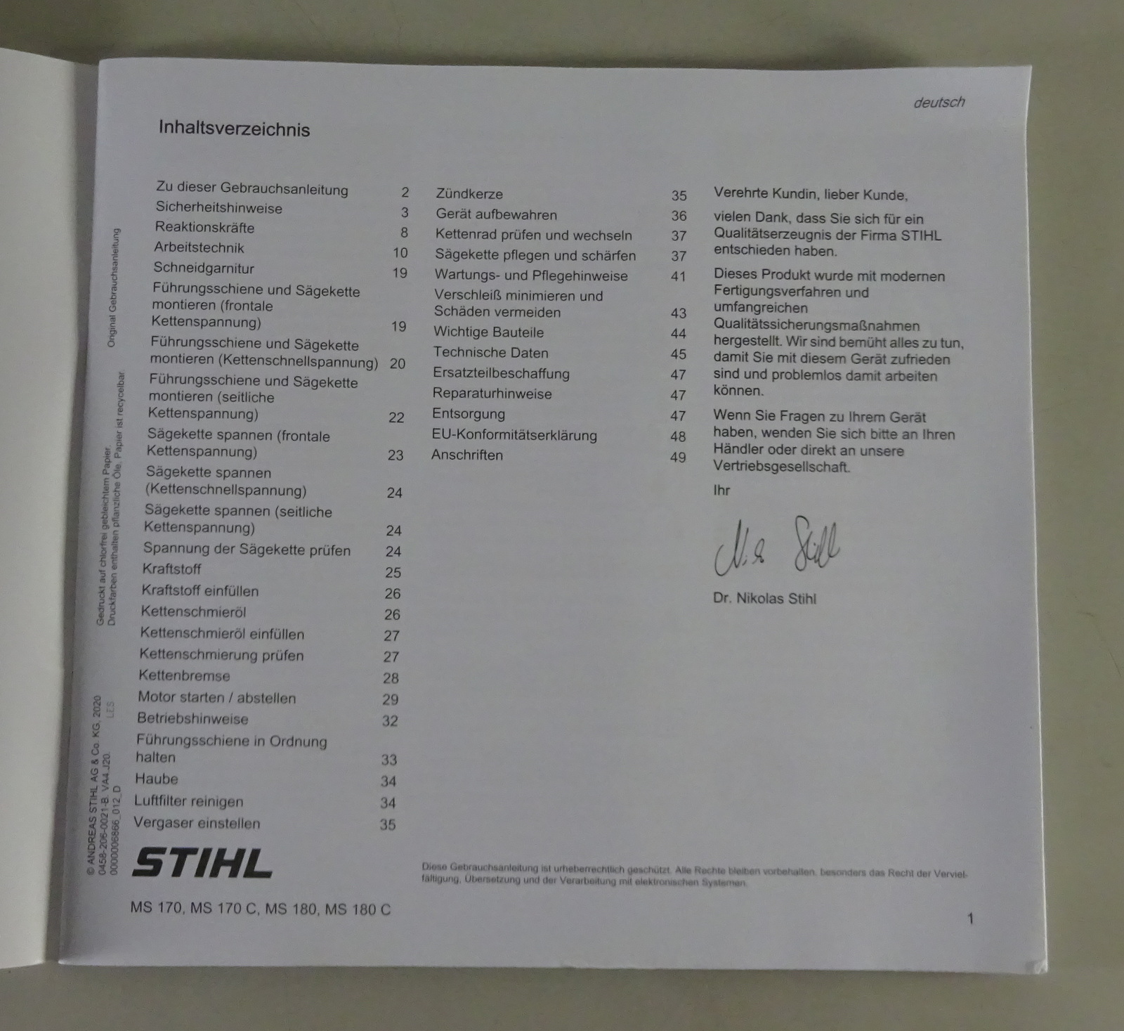 Betriebsanleitung / Handbuch original Stihl Stihl Motorsäge MS 170, 180... mehr