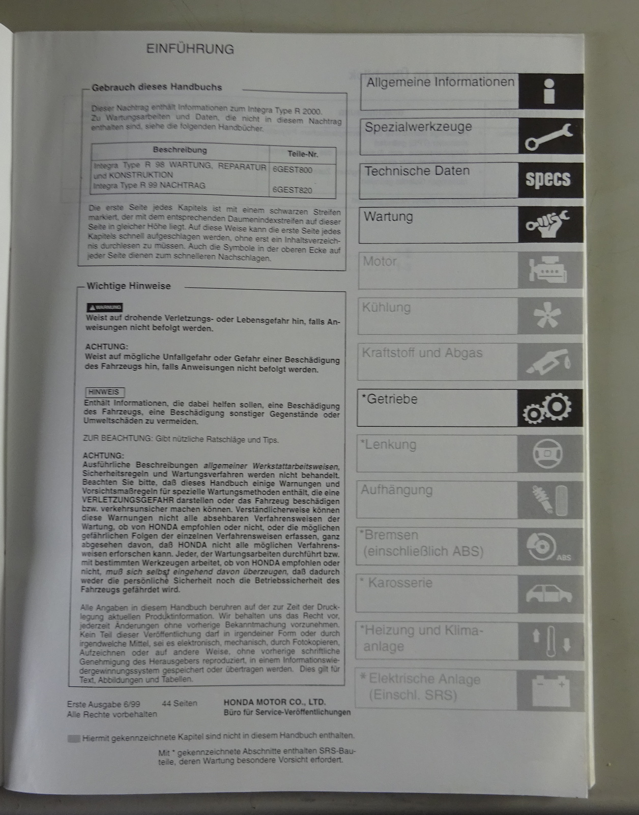 Inhalt: Allgemeine Informationen, Spezialwerkzeuge, Technische daten, Wartung, Getriebe