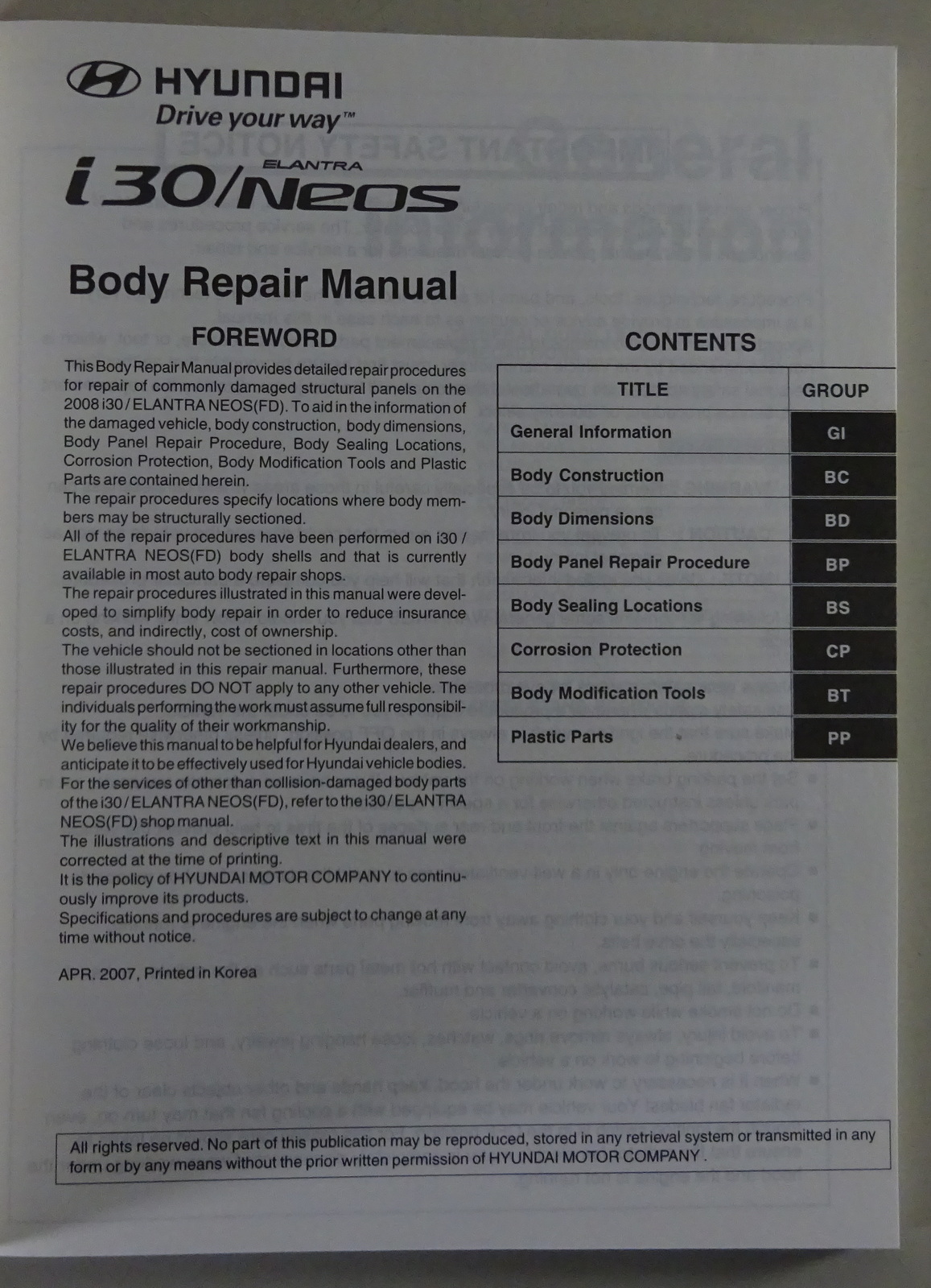 Body Repair Manual / Workshop Manaual Hyundai i 30 / Elantra Neos 2008 | 04/2007