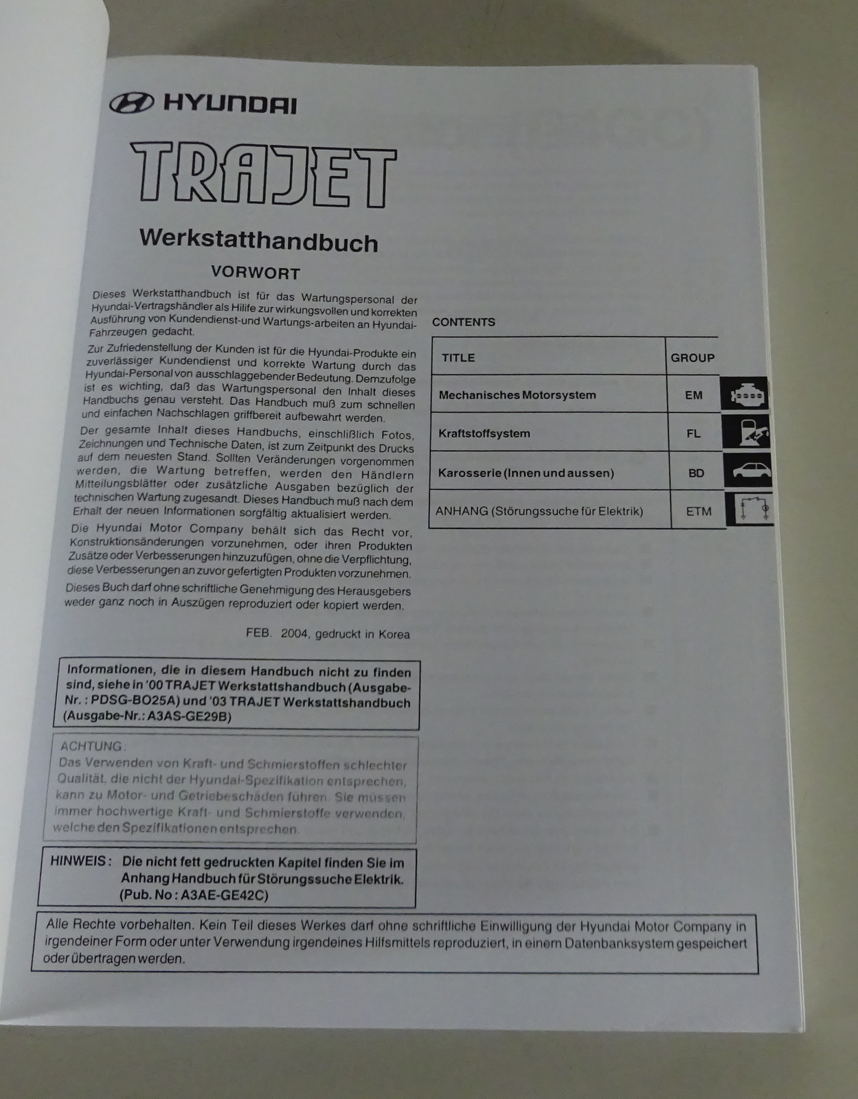Werkstatthandbuch Hyundai Trajet Typ FO Nachtrag 2004 Baujahre 1999-2004
