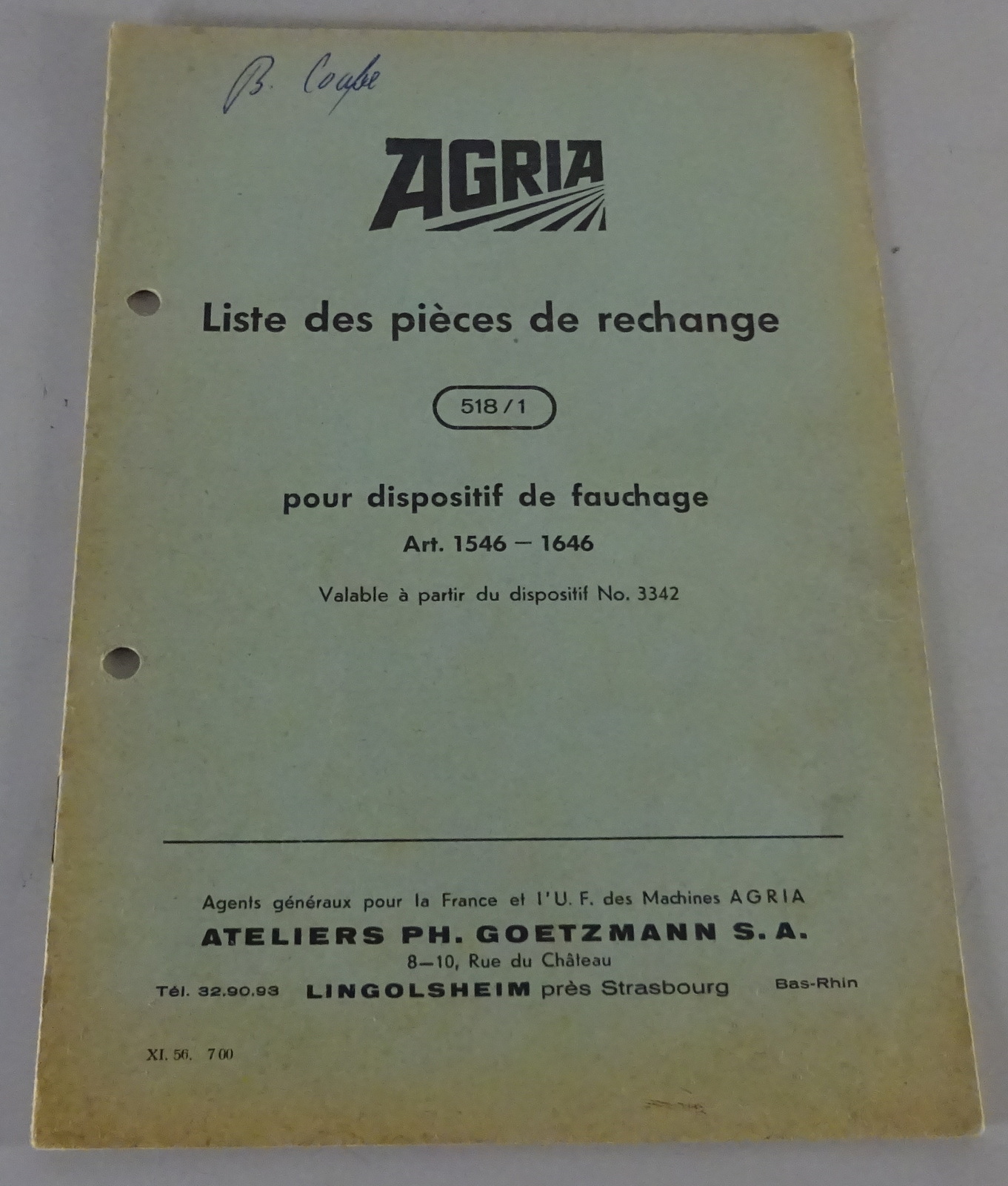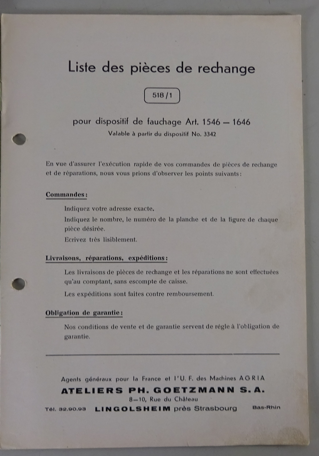 Produktinformationen "Liste des pièces de rechange | Agria pour dispositif de fauchage | FRA | 11/1956"
