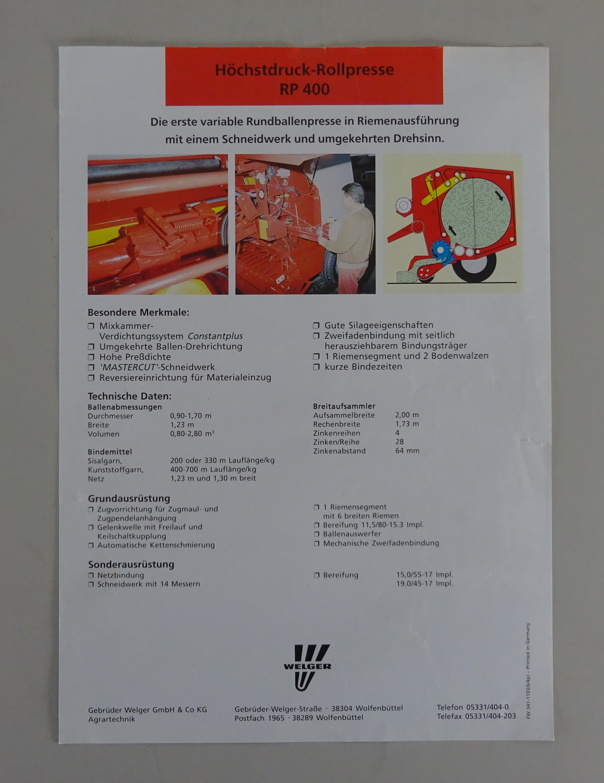 Prospektblatt / Broschüre Welger Höchstdruck-Rollpresse RP 400 Stand 11/1993