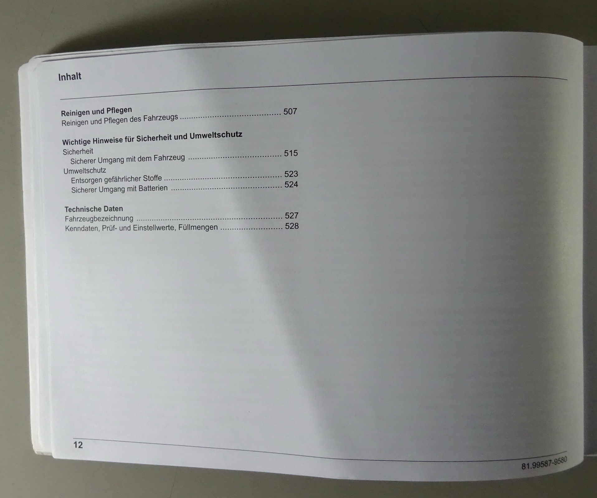 Bedienung, Technische Daten, Selbsthilfe, Fahrhinweise, Wartung/Pflege etc.