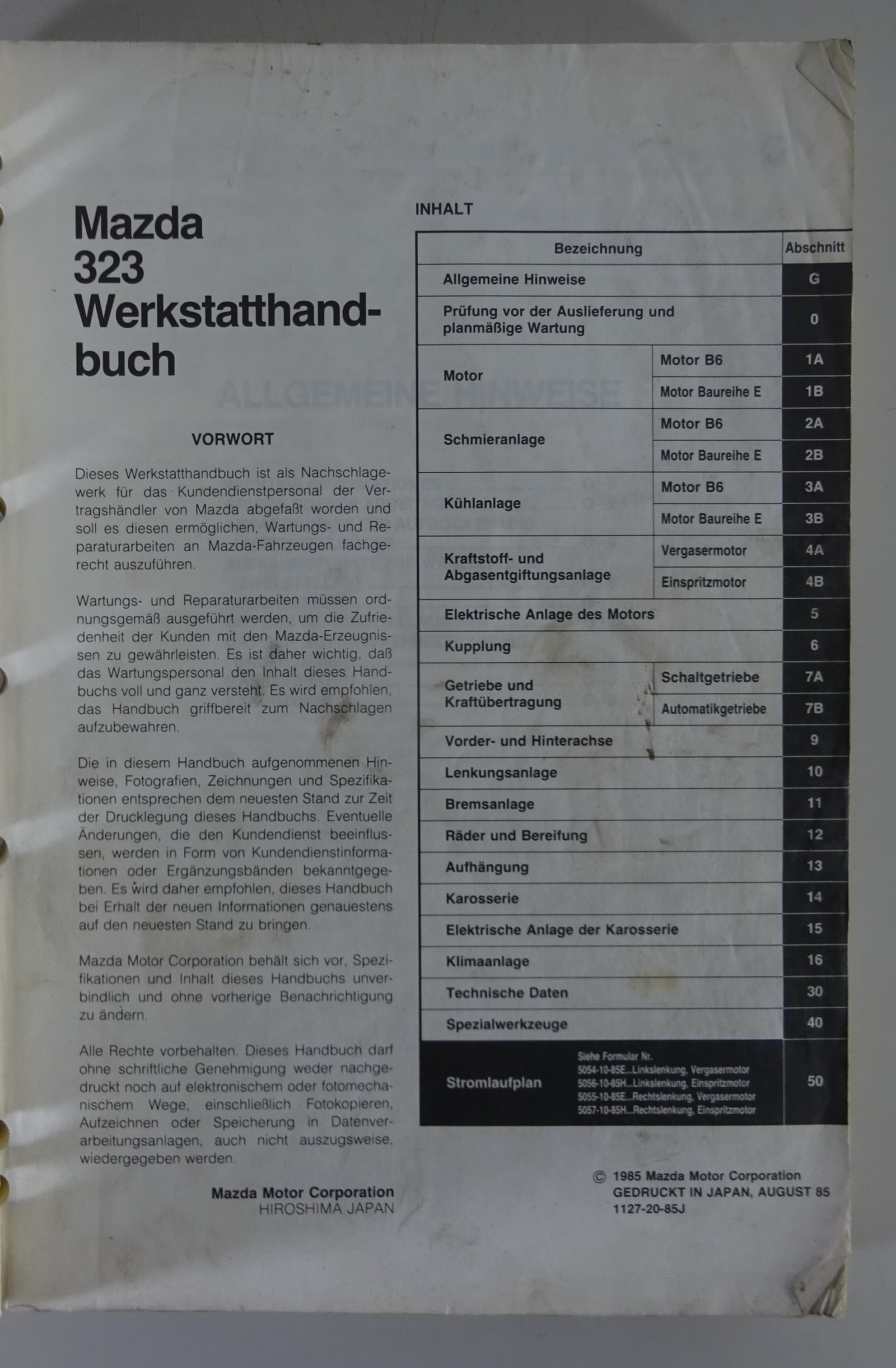 Produktinformationen "Werkstatthandbuch Grundhandbuch Mazda 323 Typ BF Motor Getriebe Bremsen, 08/1985"