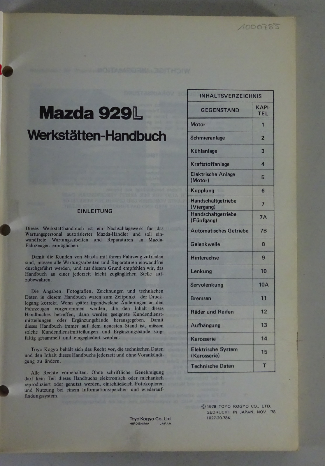 Produktinformationen "Werkstatthandbuch Mazda 929 L Motor Kupplung Getriebe Bremsen, 11/1978"