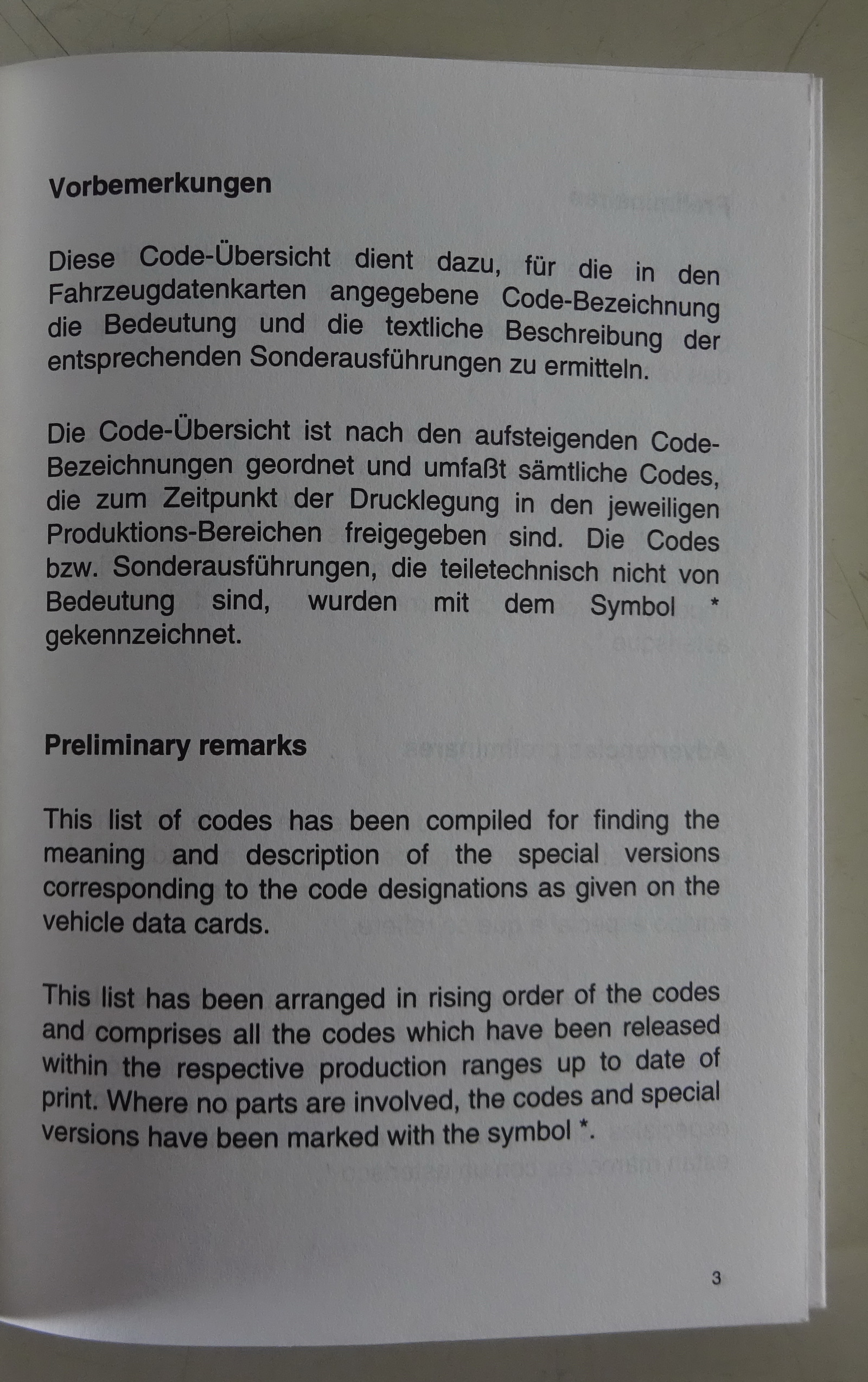 Diese Code-Übersicht dient dazu, für die in den Fahrzeugdatenkarten angegebenen Code-Bezeichnungen die Bedeutung und die textliche Beschreibung der entsprechenden Sonderausführungen zu ermitteln.