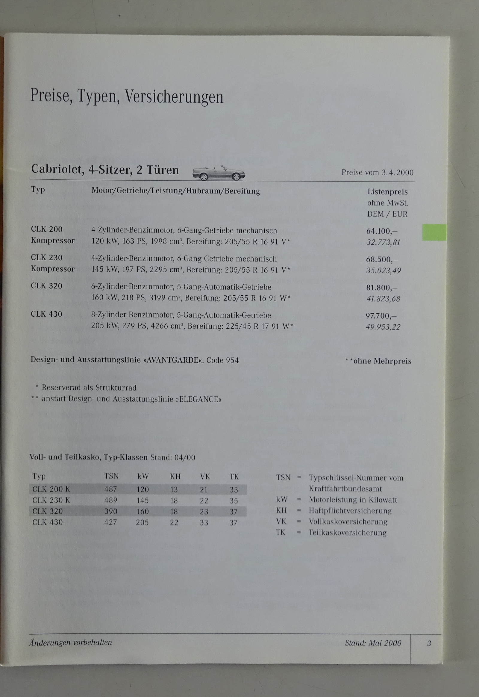 Verkaufstaschenbuch Mercedes-Benz CLK Cabrio A208 Stand 05/2000