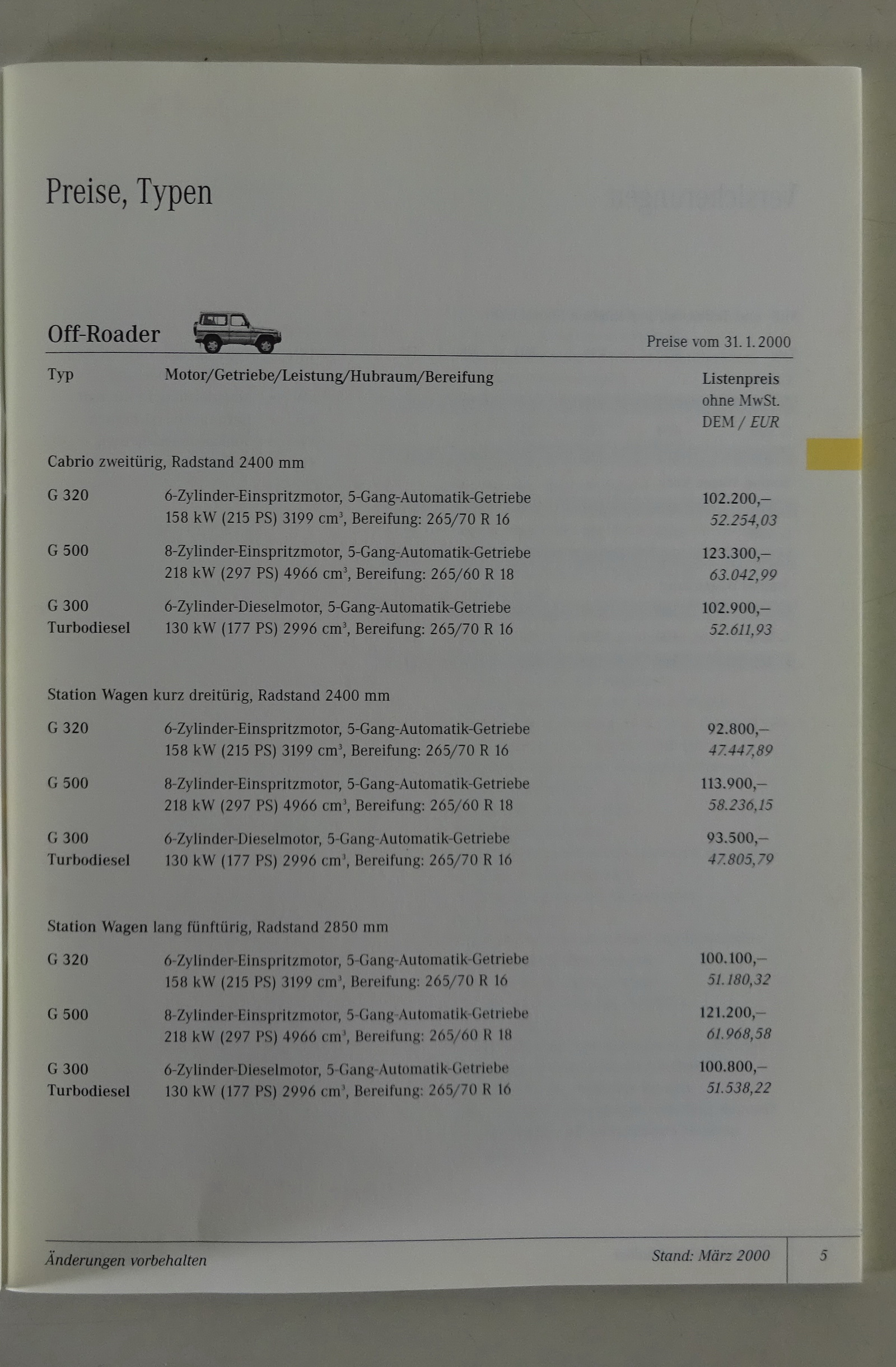 Verkaufstaschenbuch Mercedes-Benz G-Klasse / G-Modell W461 + W463 Stand 05/2000