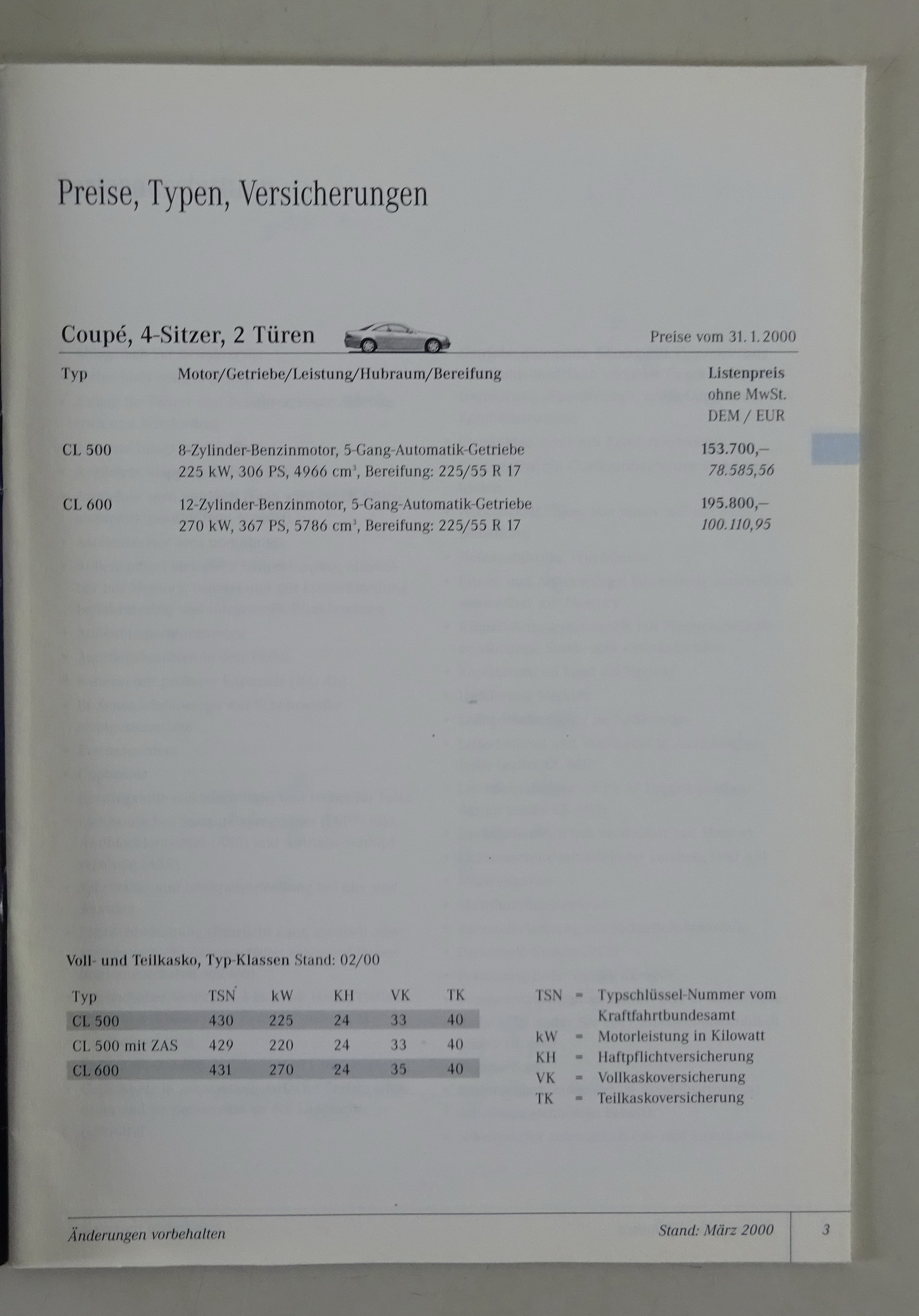Verkaufstaschenbuch Mercedes-Benz CL / C215 Stand 03/2000