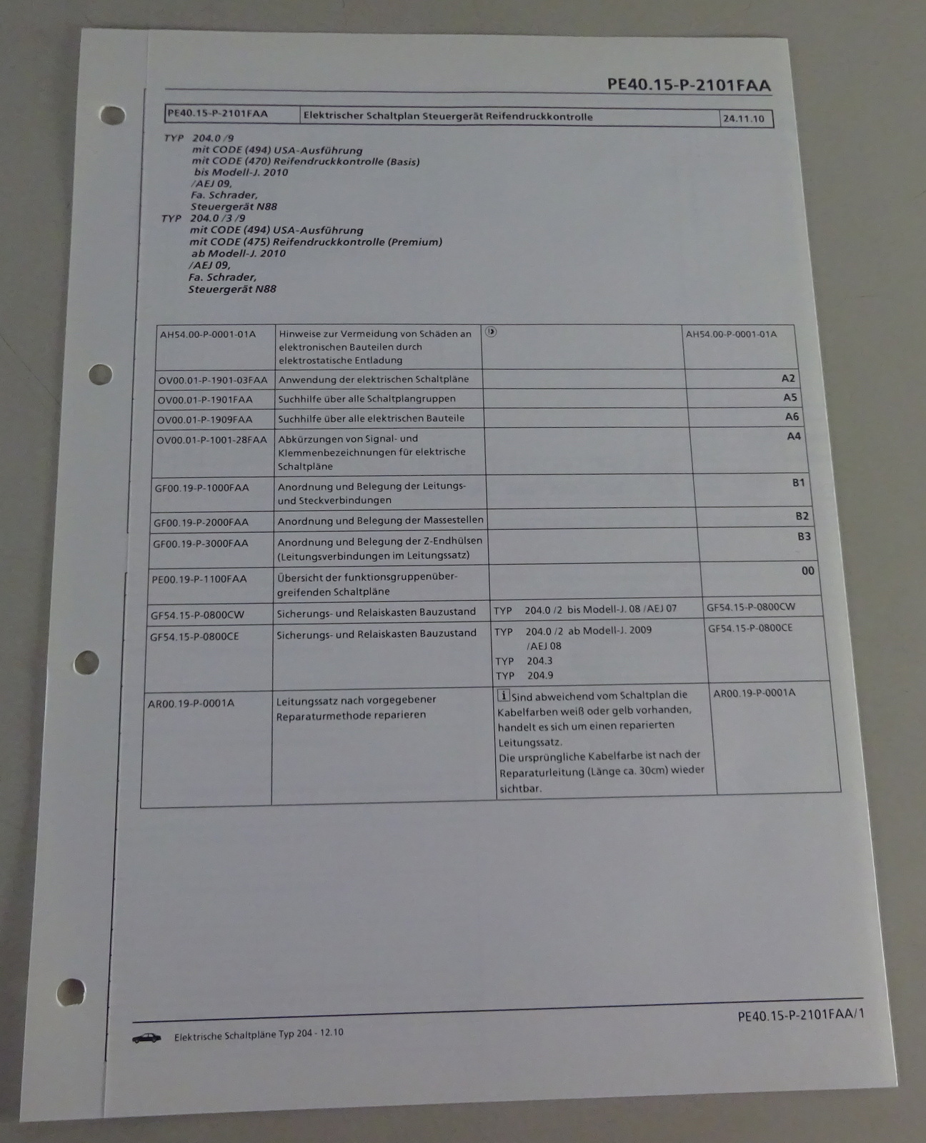Typ 204.0 / 3 / 9 mit CODE (494) USA-Ausführung / CODE (475) Reifendruckkontrolle (Premium) ab Modelljahr 2010