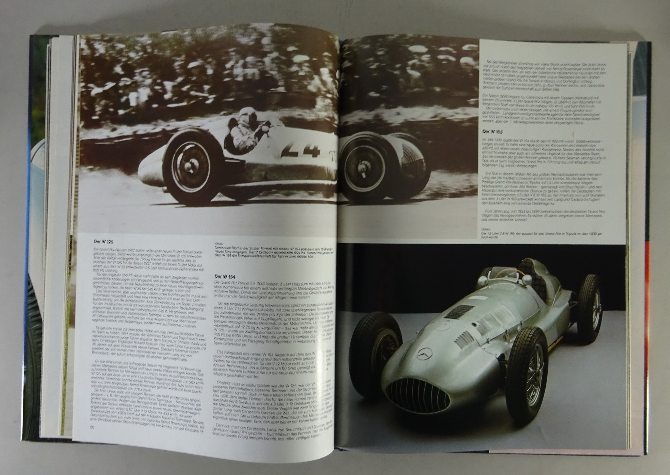 100 Jahre Auto-Geschichte ab, wobei er ausführlich auf einige wichtige und aufsehenerregende Etappen ein-geht: Die unbesiegbaren Grand Prix Wagen von 1914, 1934-39 und 1954-55, die erstaunlichen rekord-brechenden Wagen wie Blitzen Benz, GP Stromlinien-wagen und Spezial-Diesel, die legendären Kompressor-Klassiker der 30iger Jahre und Nachkriegs-Renn- und Tourenwagen. Alle diese Modelle haben dazu beigetragen, den silbernen Stern zu einem der höchst geachteten und anerkannten Markenzeichen der Welt zu machen.