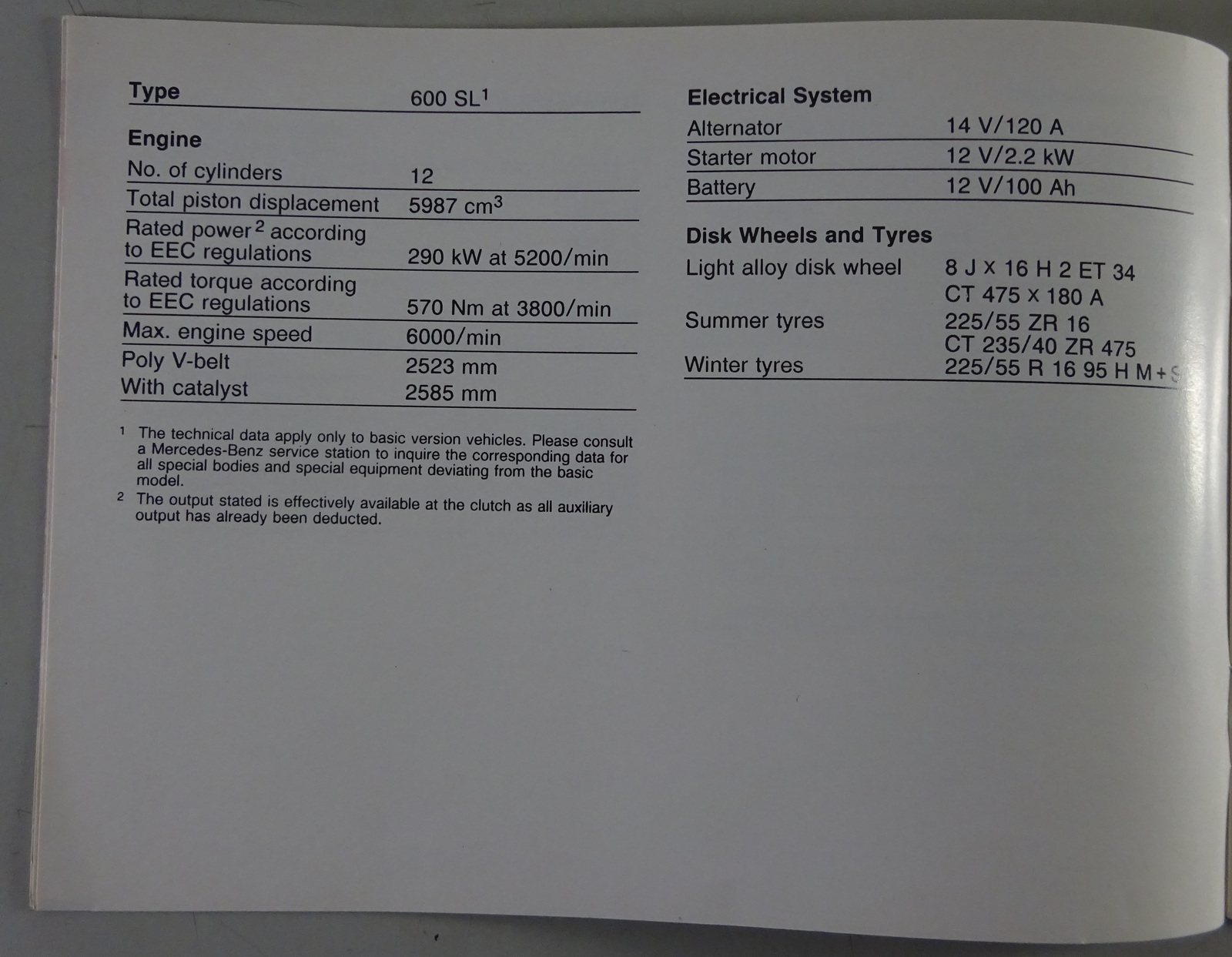 Zusatzanleitung Technische Daten Mercedes Benz 600 SL V12 R129 Stand 04/1992
