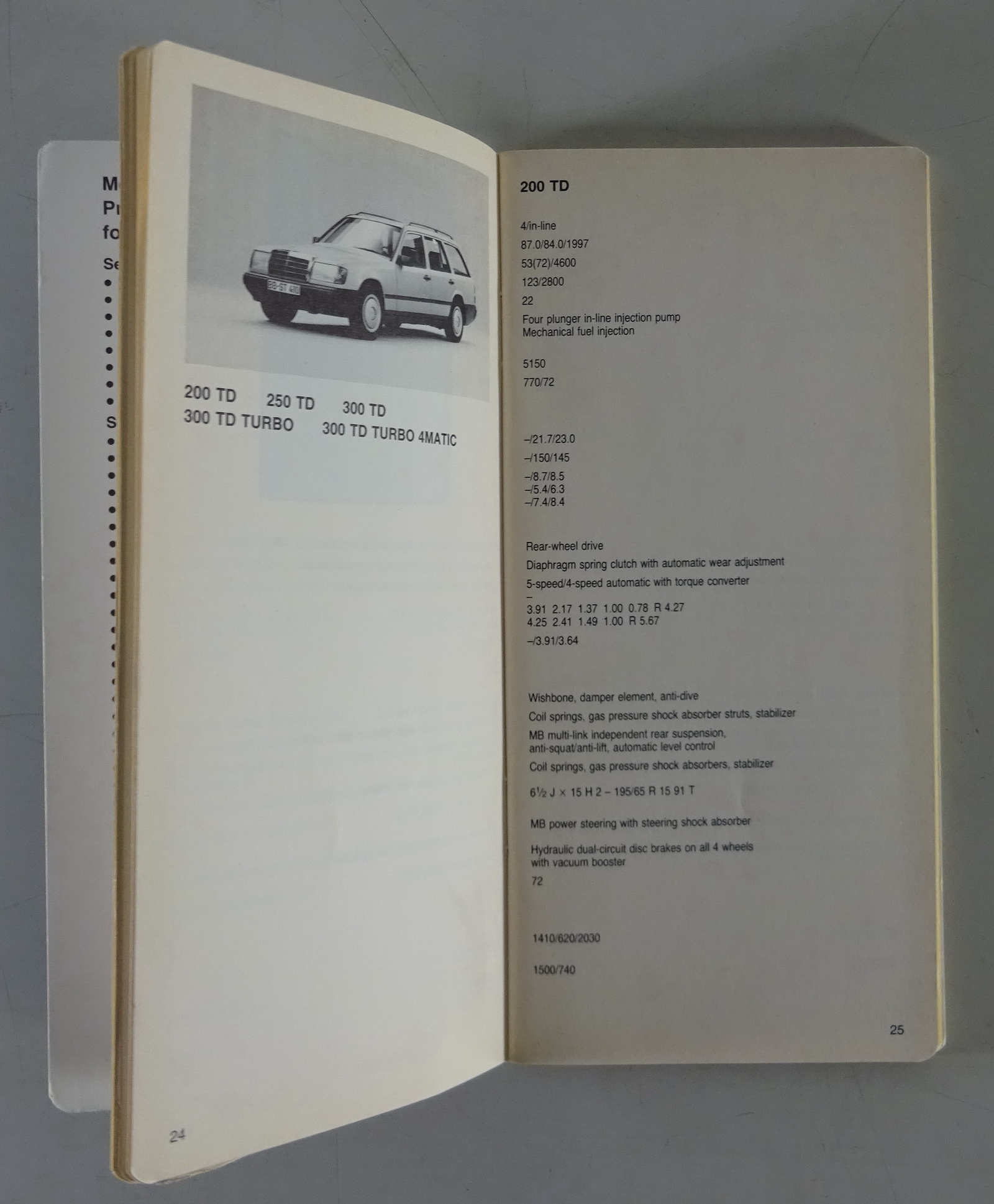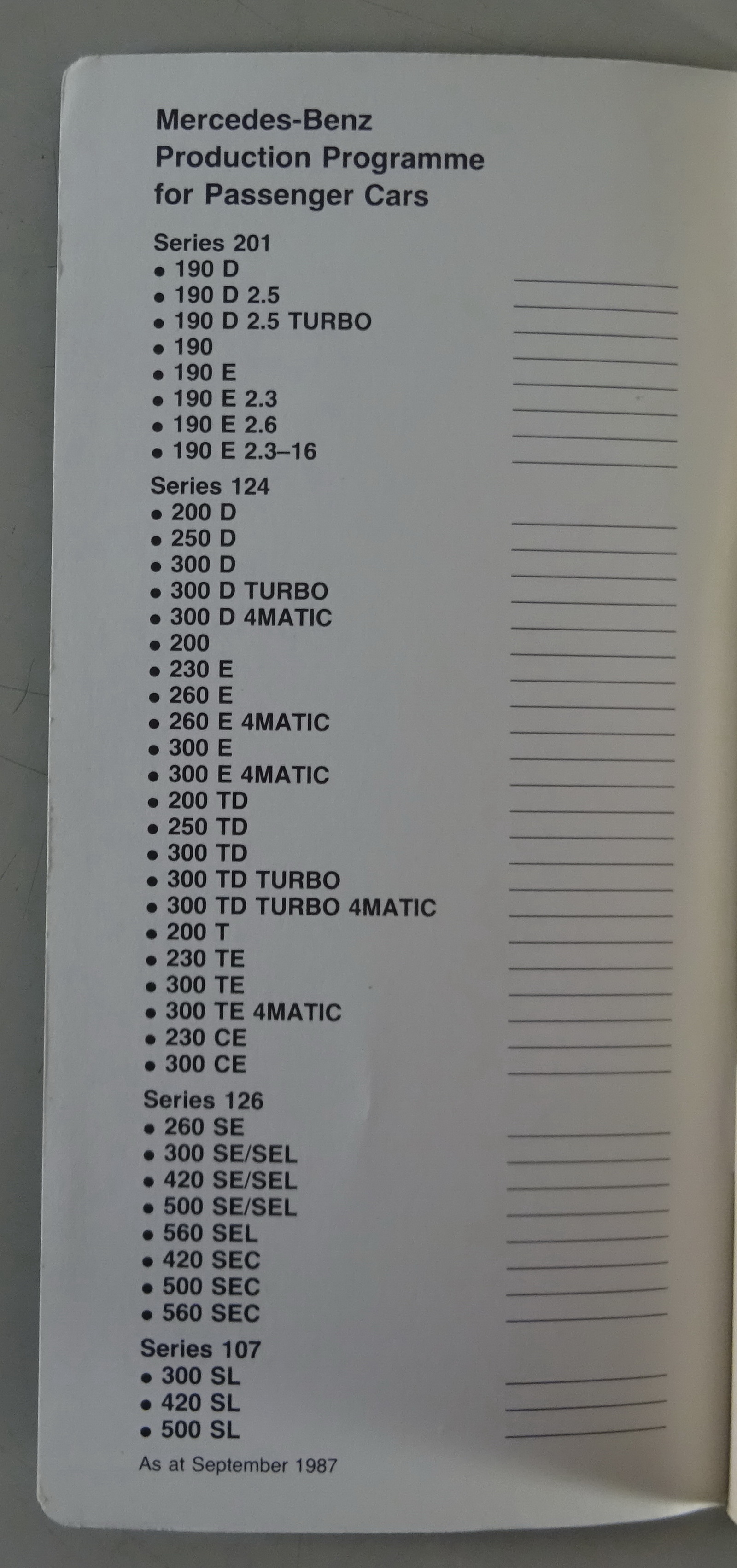 Data Book / Datenbuch Mercedes-Benz W201 / W124 / W126 / R107 Stand 09/1987