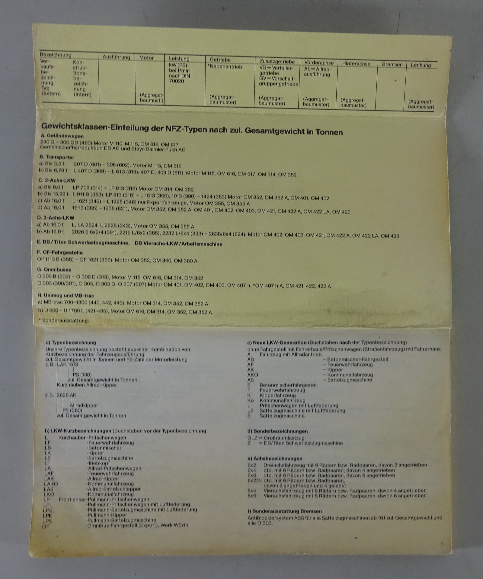 Inhalt: Verkaufsbezeichnung, Konstruktionsbezeichnung, Ausführung, Motor, Leistung, Getriebe, Zusatzgetriebe, Vorderachse, Hinterachse, Bremsen, Lenkung
