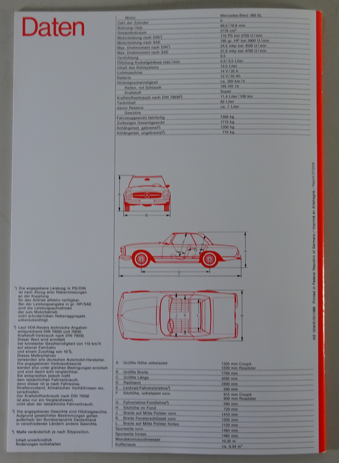 Prospekt / Broschüre Mercedes 280 SL Pagode R113 Roadster von 12/69 Reprint 2008