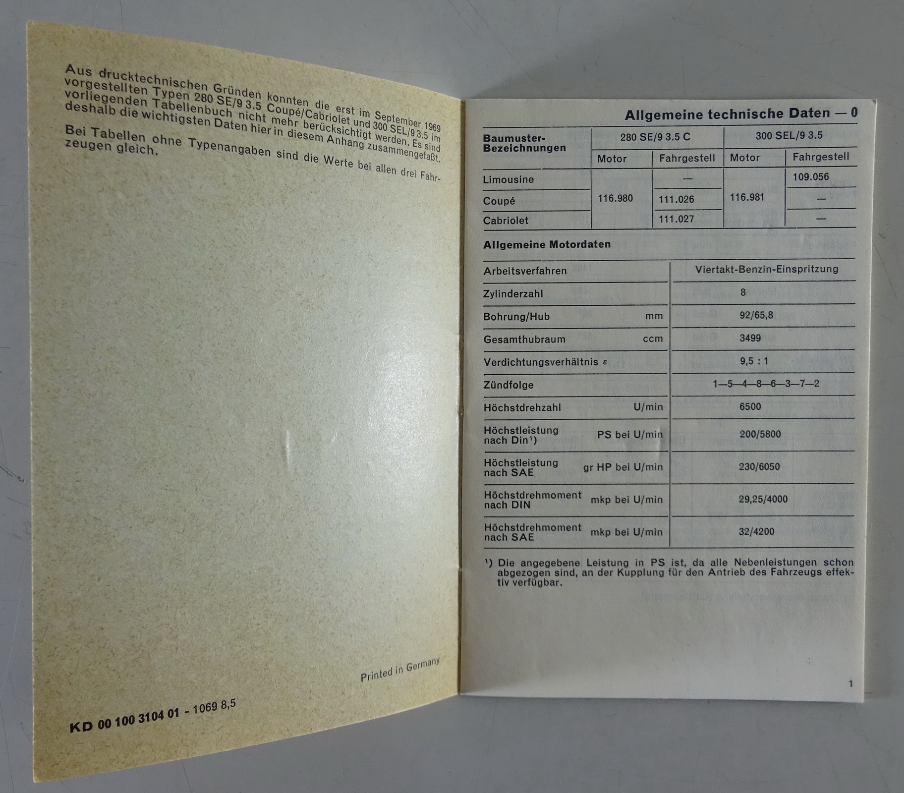 Tabellenbuch Anhang Mercedes-Benz W111 / W112 300 SEL 3,5 Cabrio, Coupé von 1969