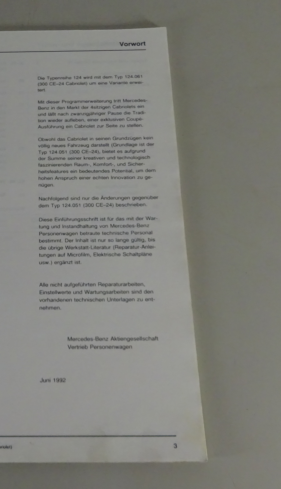 Werkstatthandbuch Einführung Mercedes A124 / W124 Cabrio 300 CE 24 Stand 6/1992