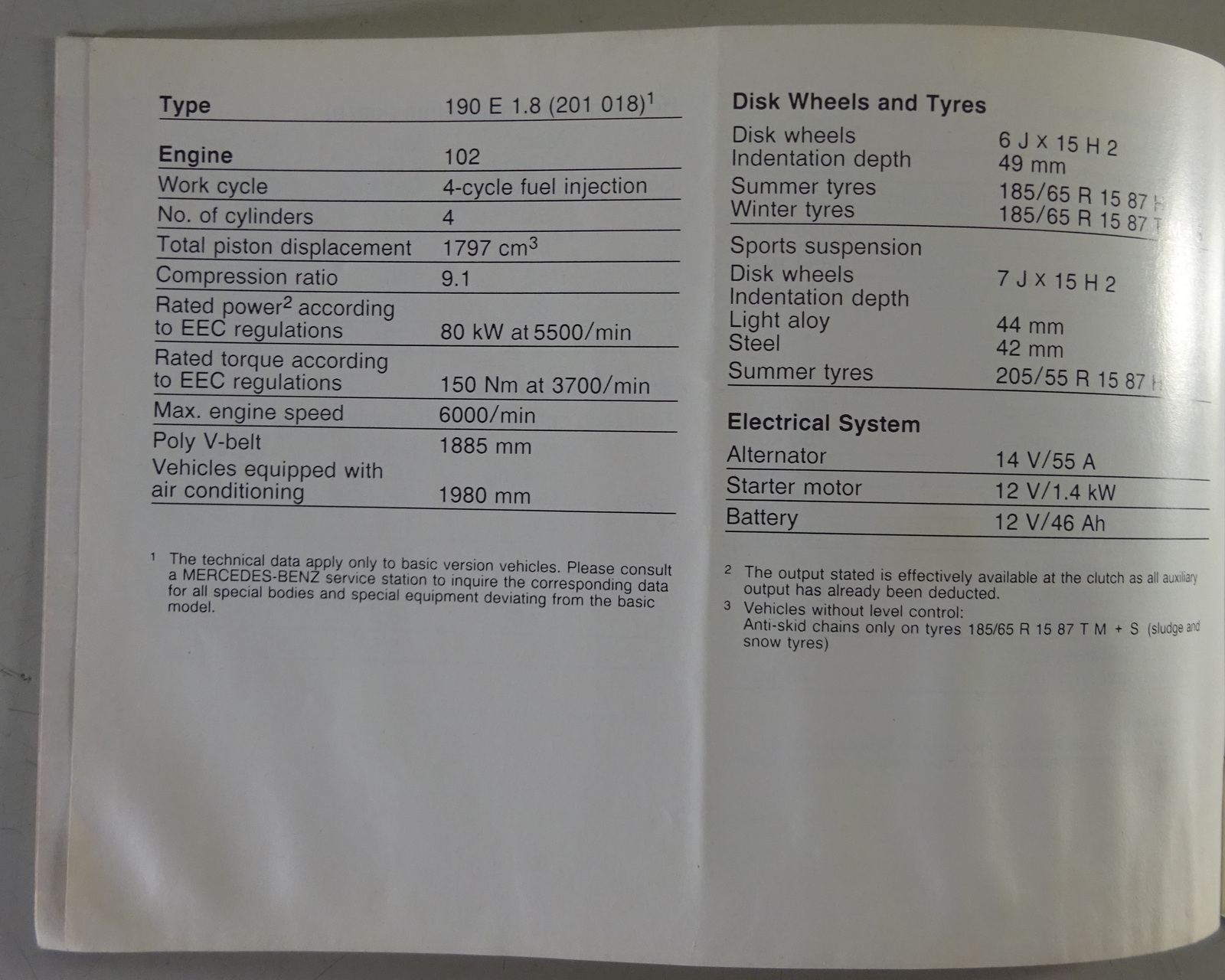 Zusatzanleitung technische Daten Mercedes W201 190 E 1.8 Stand 02/1990