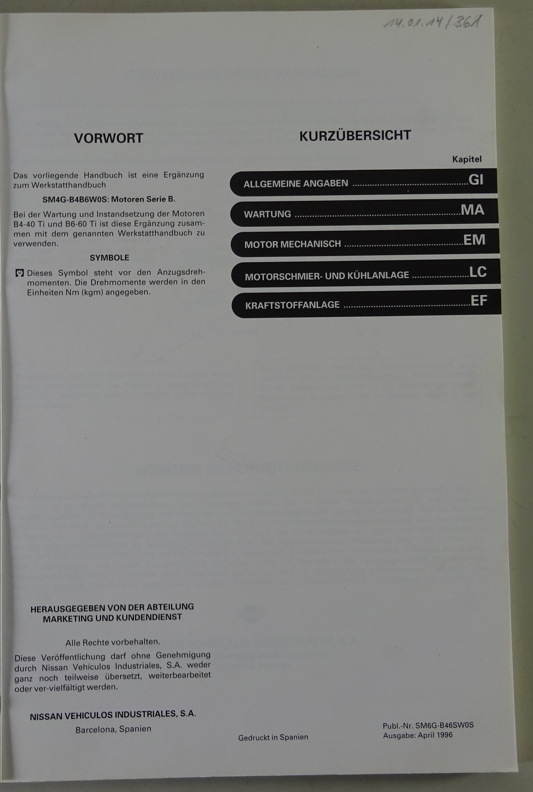 Werkstatthandbuch Nissan Motoren Serie BTi Wartungsanleitung Ergänzung 1 v 04/96