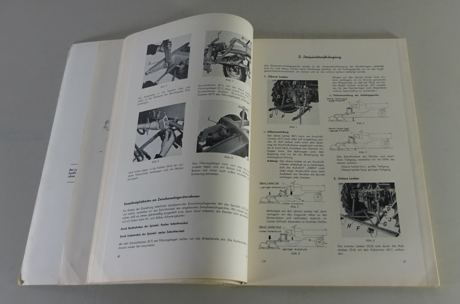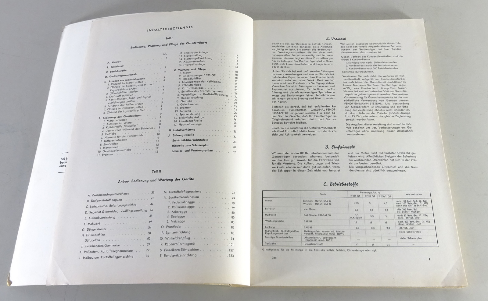Inhalt: Einfahrzeit, Betriebsstoffe, Geräteträgermerkmale, Arbeiten vor Inbetriebnahme, Bedienung des Geräteträger, Wartung und Pflege, Unfallverhütung, Störungstabelle, Schmierpläne, Anbau, Bedienung und Wartung der Geräte