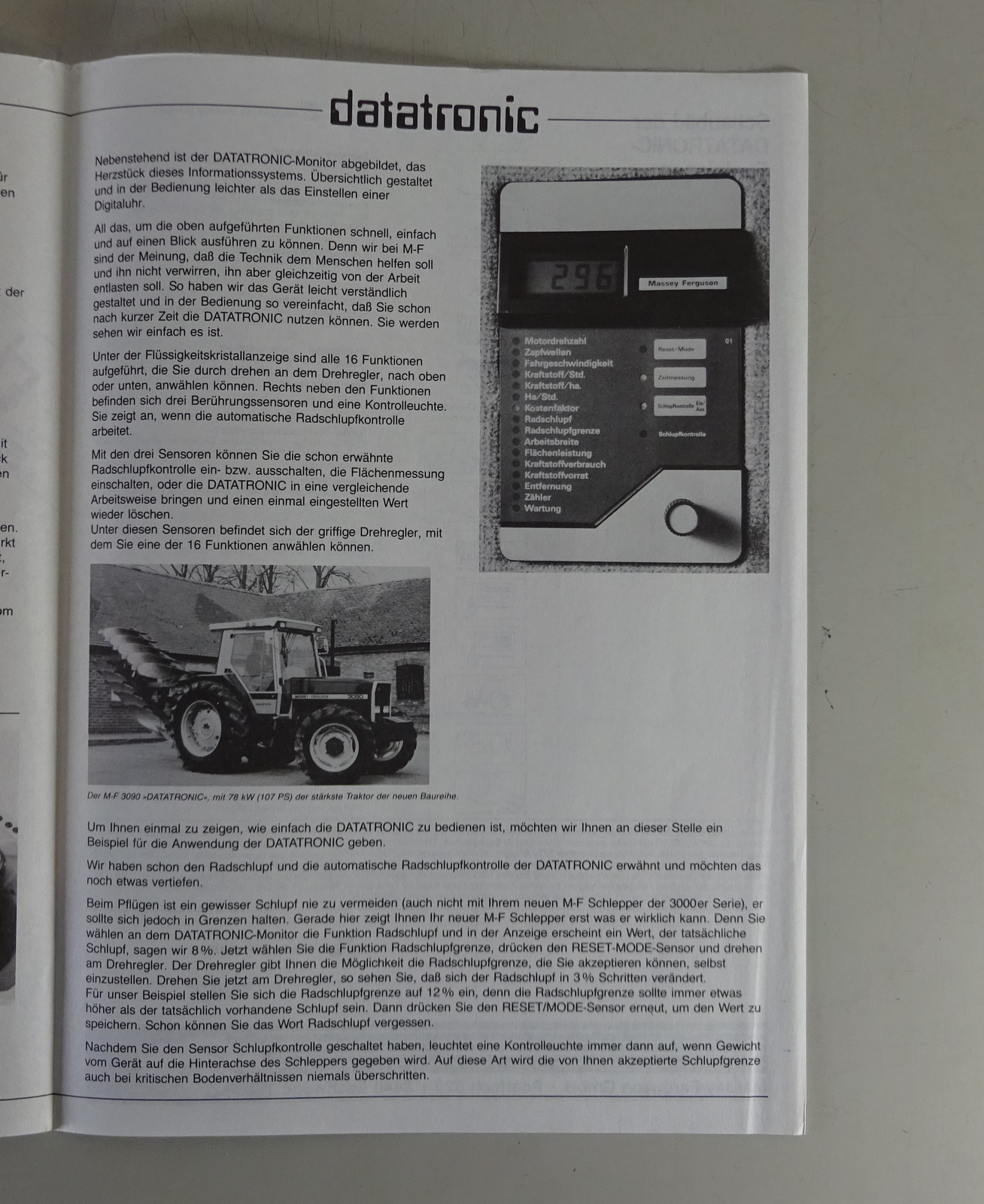 Prospekt / Datenblatt Massey Ferguson MF 3000 mit Datatronic Stand 04/1987