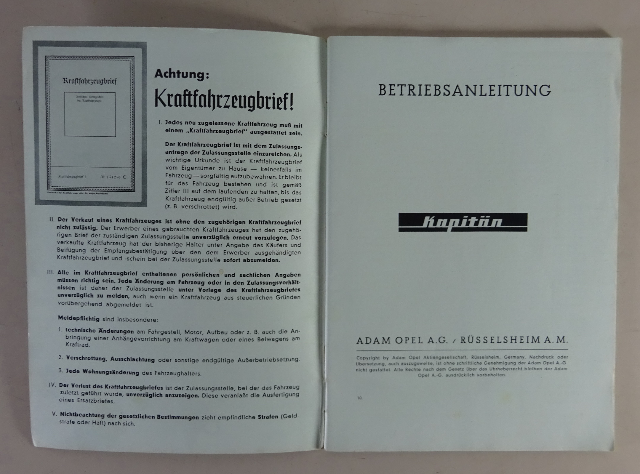 Betriebsanleitung / Handbuch Opel Kapitän '39 2,5 ltr. 6 Zyl. Baujahre 1938-1940
