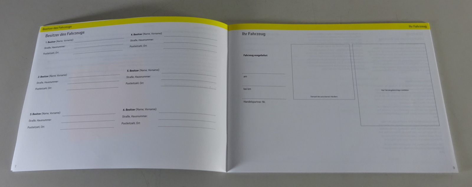 Inhalt: Besitzer des Fahrzeuges, Wartungsnachweise, Nachweis über Austausch von Steuergeräten, Sensoren, Tachometer oder Software