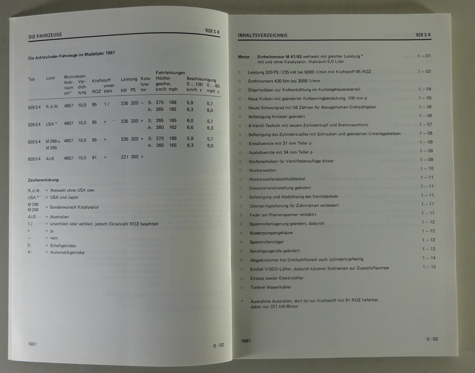 Inhalt: Änderungen 1987 beim Modell Porsche 928 S4, Motor M 41 / 42, Einspritzanlage LH, Zündanlage EZ, Kupplung, Getriebe G 28, Automatikgetriebe A 28, Fahrwerk, Bremsanlage, Karosserie, Klimaanlage, Elektrik mit Schaltplänen, Technische Daten und Einstellwerte