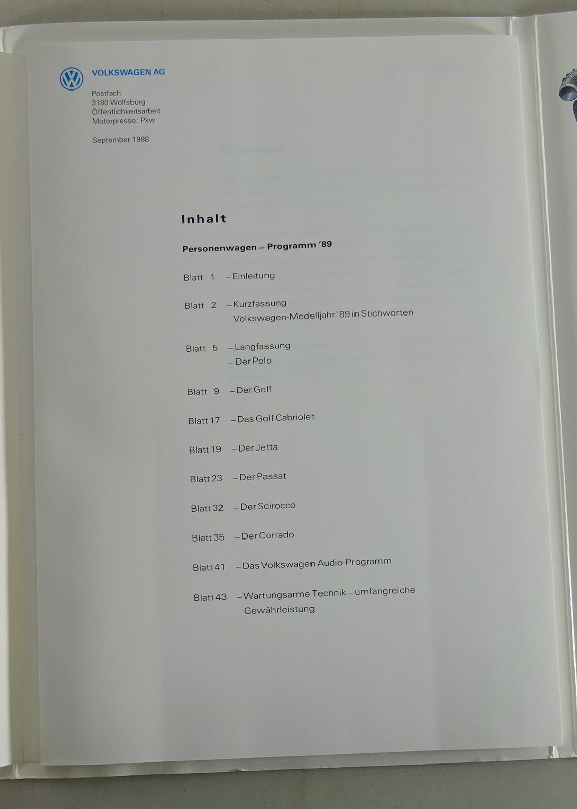 Pressemappe VW Golf II / 2 incl. GTI, Corrado, Golf 1 Cabrio etc. von 09/1988