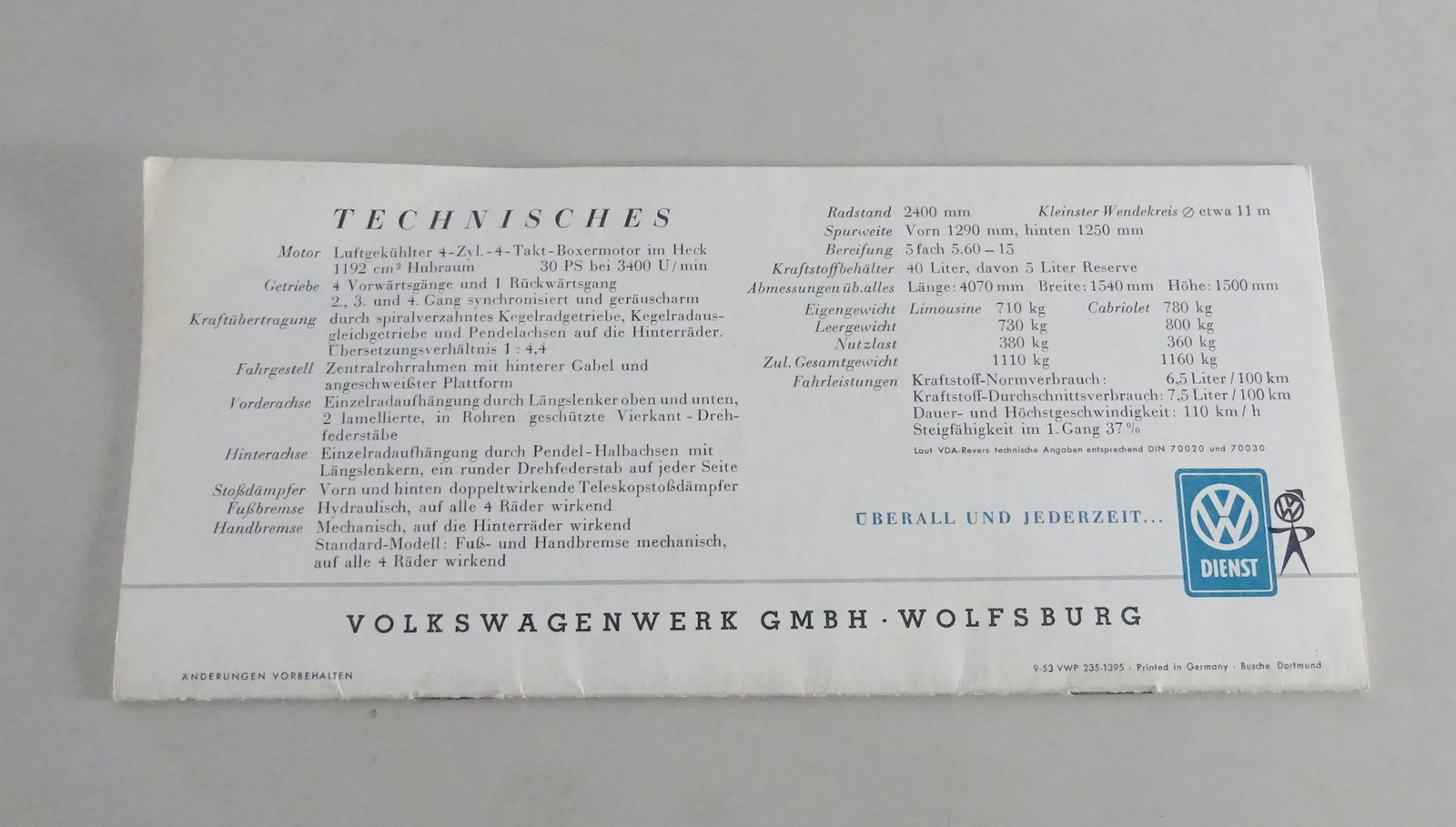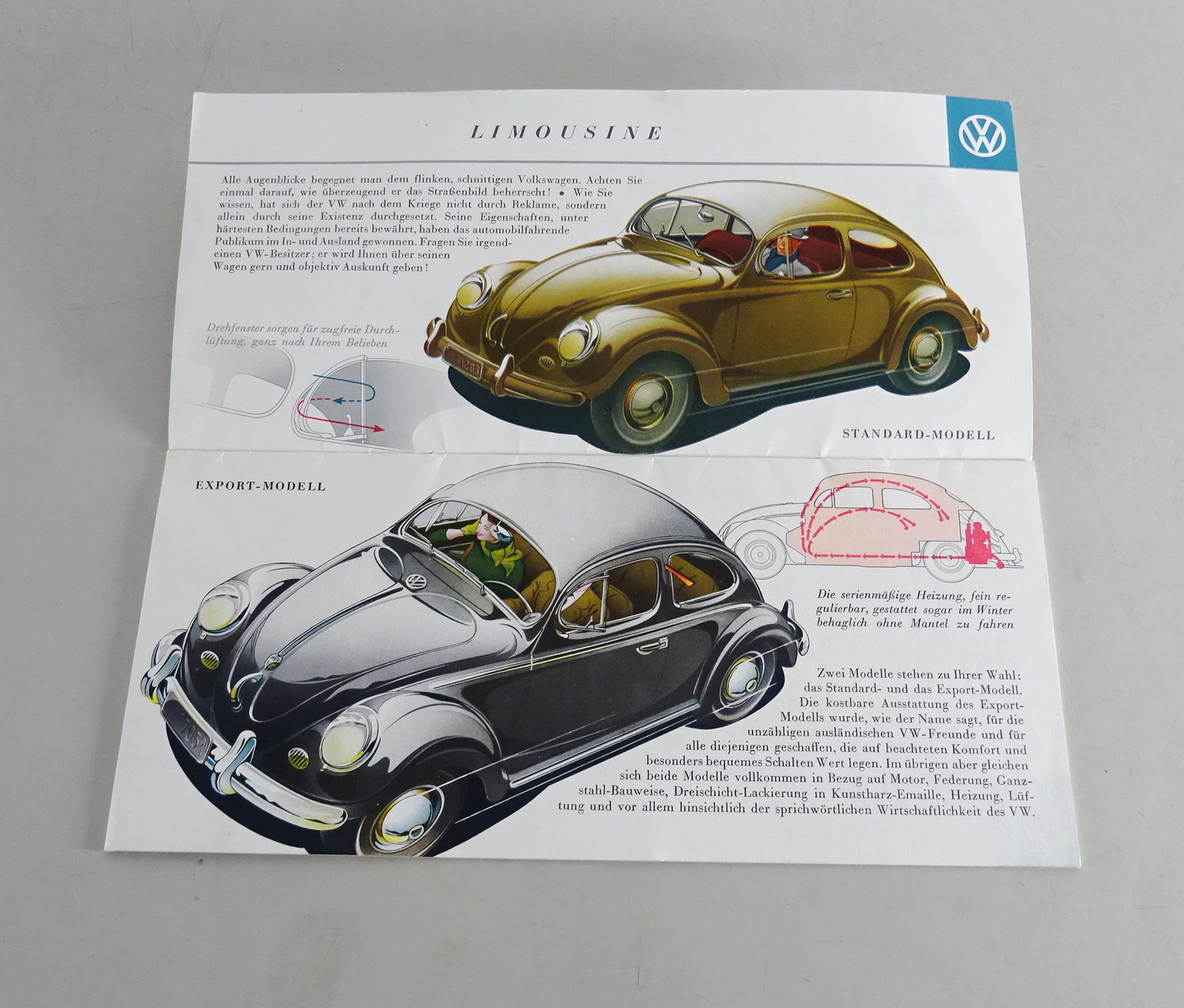 Prospekt VW Käfer Standard, Export + Cabrio ( Ovali ) von 09/1953