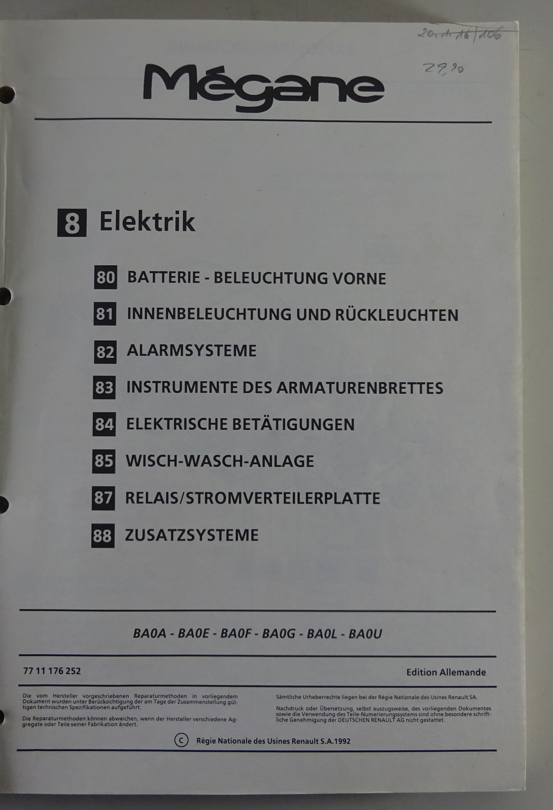 Werkstatthandbuch Renault Megane - 8 Elektrik - MR 312 Stand 1992