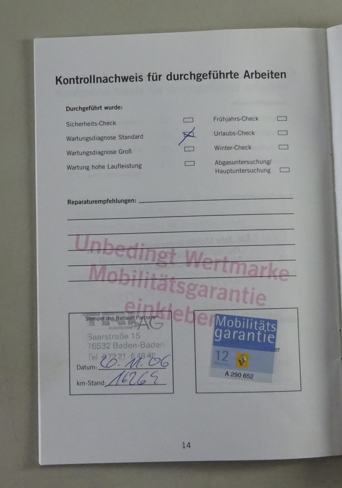 Inhalt: Betriebsanleitung, Gamme Radiosat, Garantie & Service mit Eintragungen bis 16.269 km.