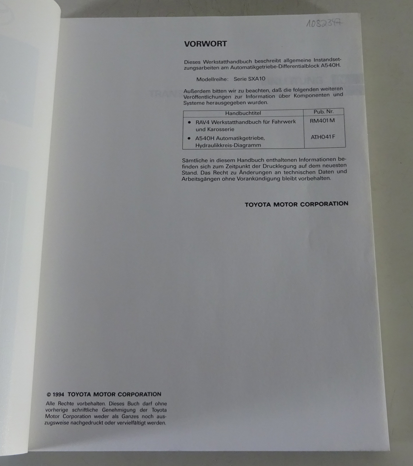 Werkstatthandbuch Toyota RAV4 (Typ XA1) Automatikgetriebe A540H Stand 04/1994
