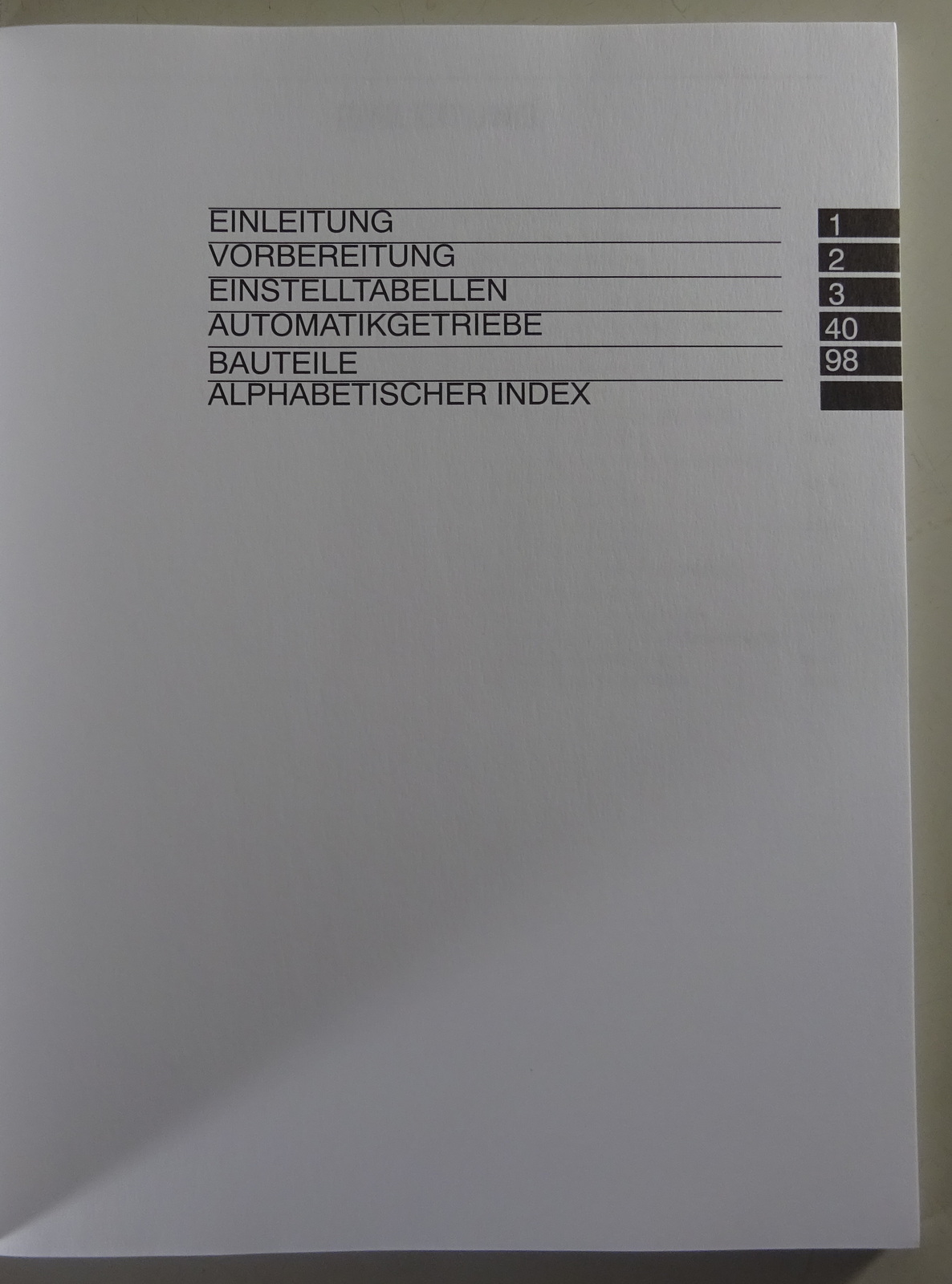 Inhalt: Einleitung, Einstelltabellen, Automatikgetriebe, SST, SSM, Anzugsdrehmomente für Standardschrauben