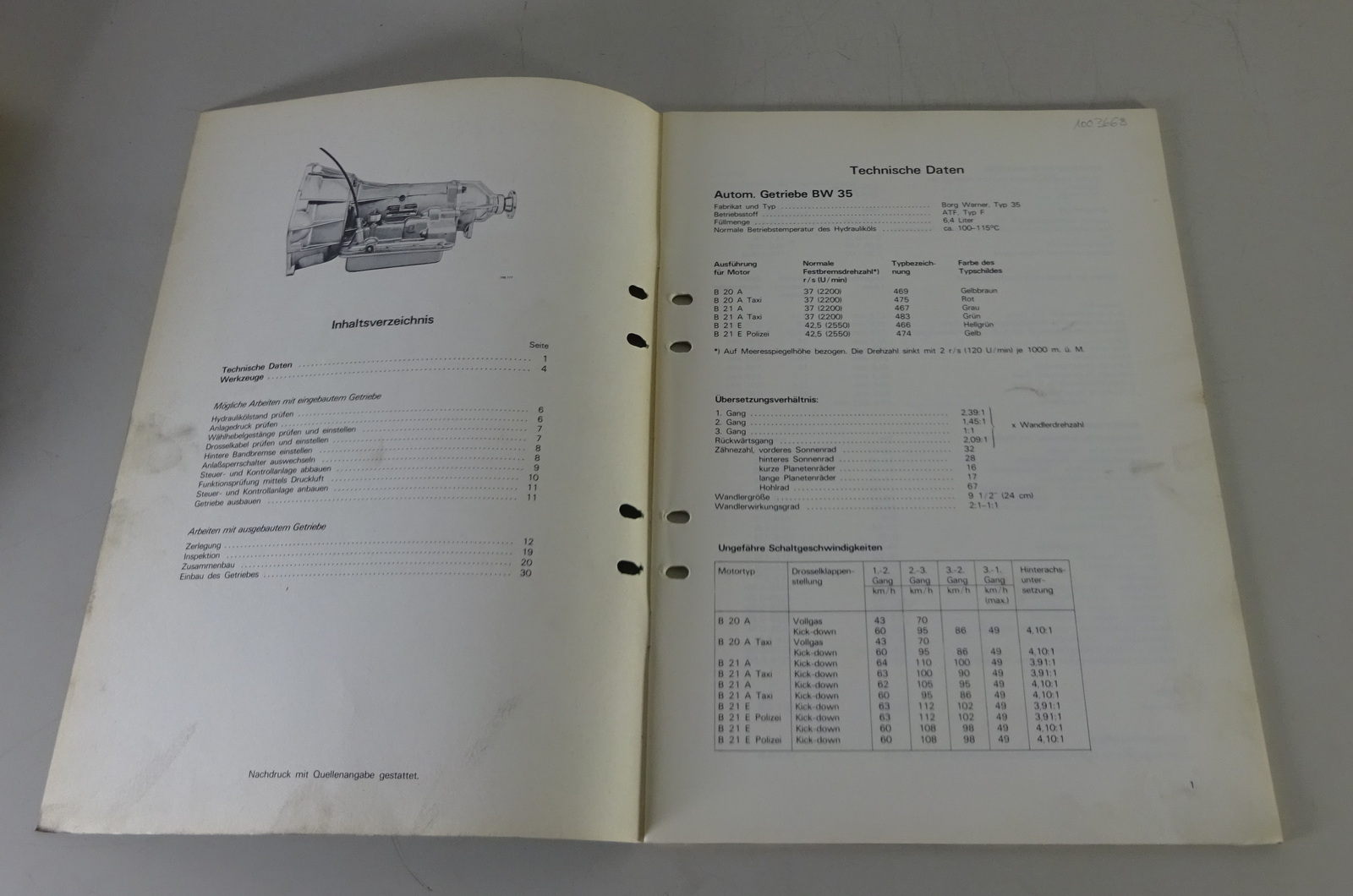 Inhalt: Reparatur und Instandhaltung - Technische Daten, Spezialwerkzeug, Arbeiten am Ein-/Ausgebauten Getriebe